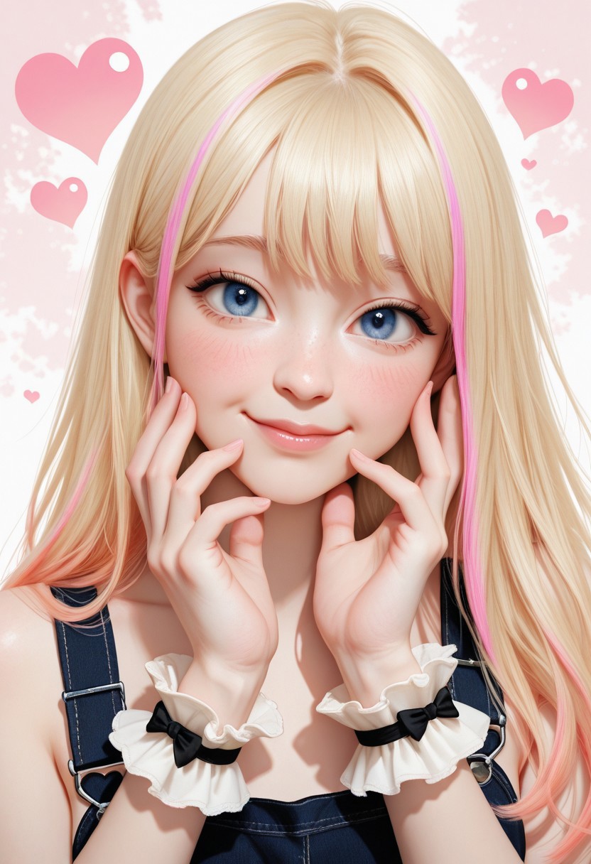 A charming portrait of a young woman with long, straight blonde hair featuring soft pink highlights. She has striking blue eyes, a gentle smile, and her cheeks are adorned with a light blush, enhancing her youthful appearance. The subject is framed within a minimalist background, drawing attention to her expressive features. Her pose is playful, with both hands elegantly positioned under her chin, fingers forming a heart shape, conveying warmth and approachability. She wears a stylish black top with ruffled cuffs, which contrasts beautifully with her light hair and creates a modern vibe. The lighting is soft and diffused, mimicking a natural daylight effect, adding a gentle glow to her skin. The overall composition is centered, ensuring the viewer's focus remains on her facial expression and charming demeanor. The mood is light and cheerful, reminiscent of contemporary digital art styles, combining elements of anime influence with realistic textures. This portrait encapsulates a feeling of innocence and playfulness, inviting the observer to connect with the character's joyful spirit.
