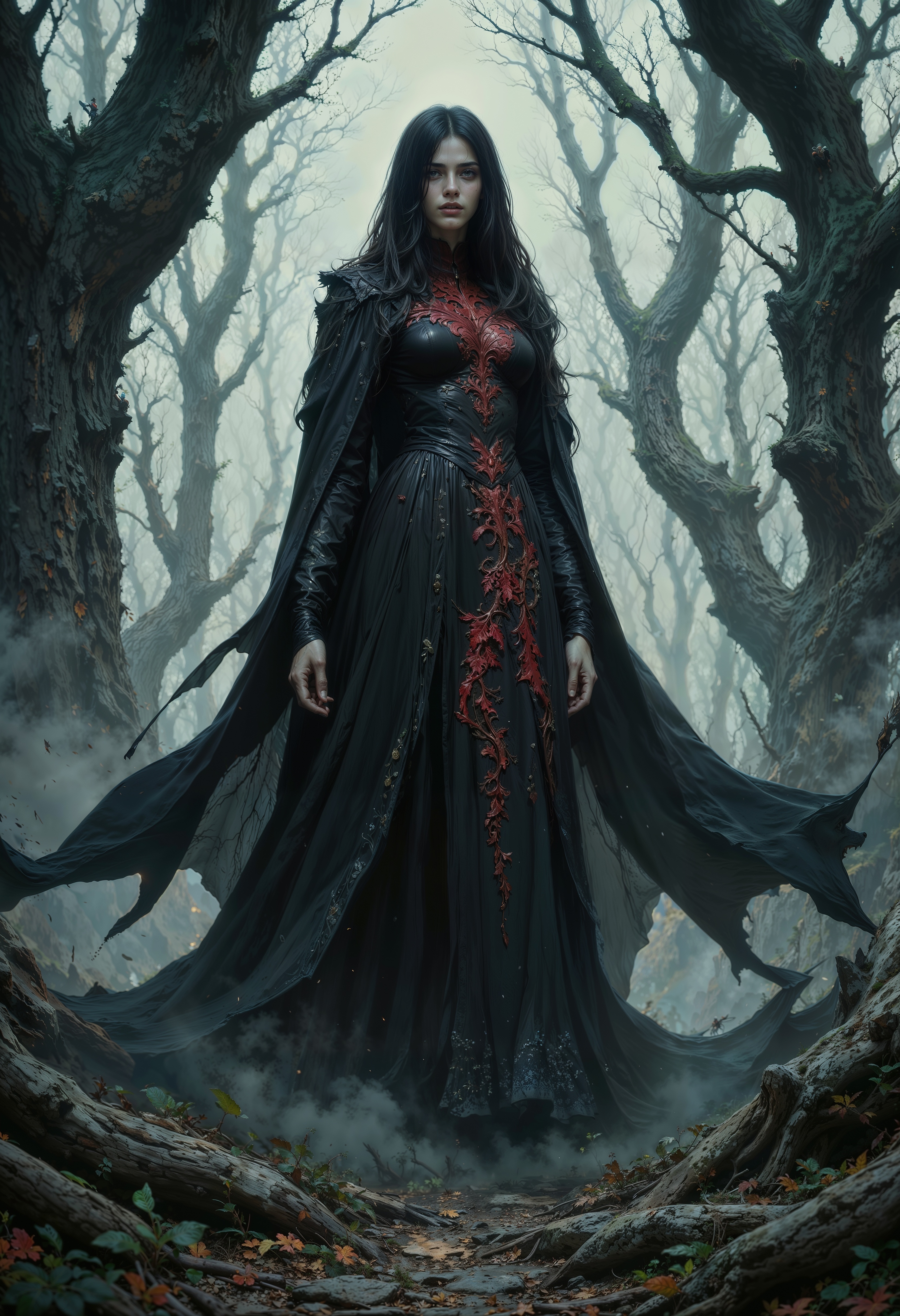 A mysterious witch with long, dark, silky black hair cascading down her back, and piercing glowing red eyes that seem to emanate an otherworldly intensity, stands solo in a mist-shrouded, ancient forest, enveloped by an unsettling silence, surrounded by twisted, gnarled, and bare dead trees that stretch towards the sky like skeletal fingers. Her slender figure, clad in a flowing, dark, velvet cloak with intricate, crimson embroidery, blends seamlessly with the eerie atmosphere, exuding an aura of mystique and power. The misty veil that wraps around her ankles adds to the enigmatic ambiance, casting long, ominous shadows across the forest floor, as if the very spirits of the forest are swirling around her. The overall serene style is tempered by an undercurrent of foreboding, as if the witch is the keeper of ancient secrets, waiting to be unearthed in the heart of this hauntingly beautiful forest.