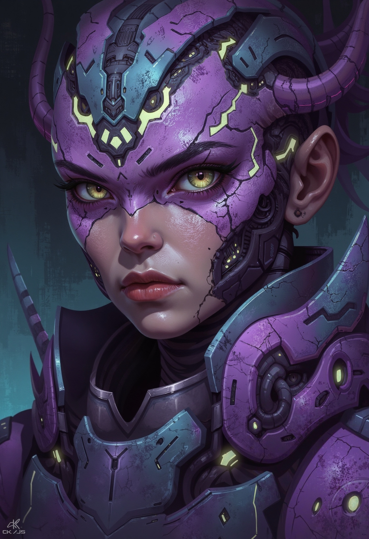 A digital painting portrait in the style of ck-js, portraying a beautiful woman from a resilient, Zerg-inspired exotic species, bearing subtle signs of her past. Her features are striking, possibly marked by fine, healed scar patterns across sections of iridescent carapace (shifting purples, greens, blues) integrated into her skin or forming part of her natural defenses. Faint bio-luminescent traceries (cool whites or pale yellows) might highlight these features. Her gaze is strong and enduring, hinting at experiences without being overtly grotesque. Her beauty is defined by strength and survival. Focus on exotic beauty marked by resilience, iridescent textures, and quiet power.