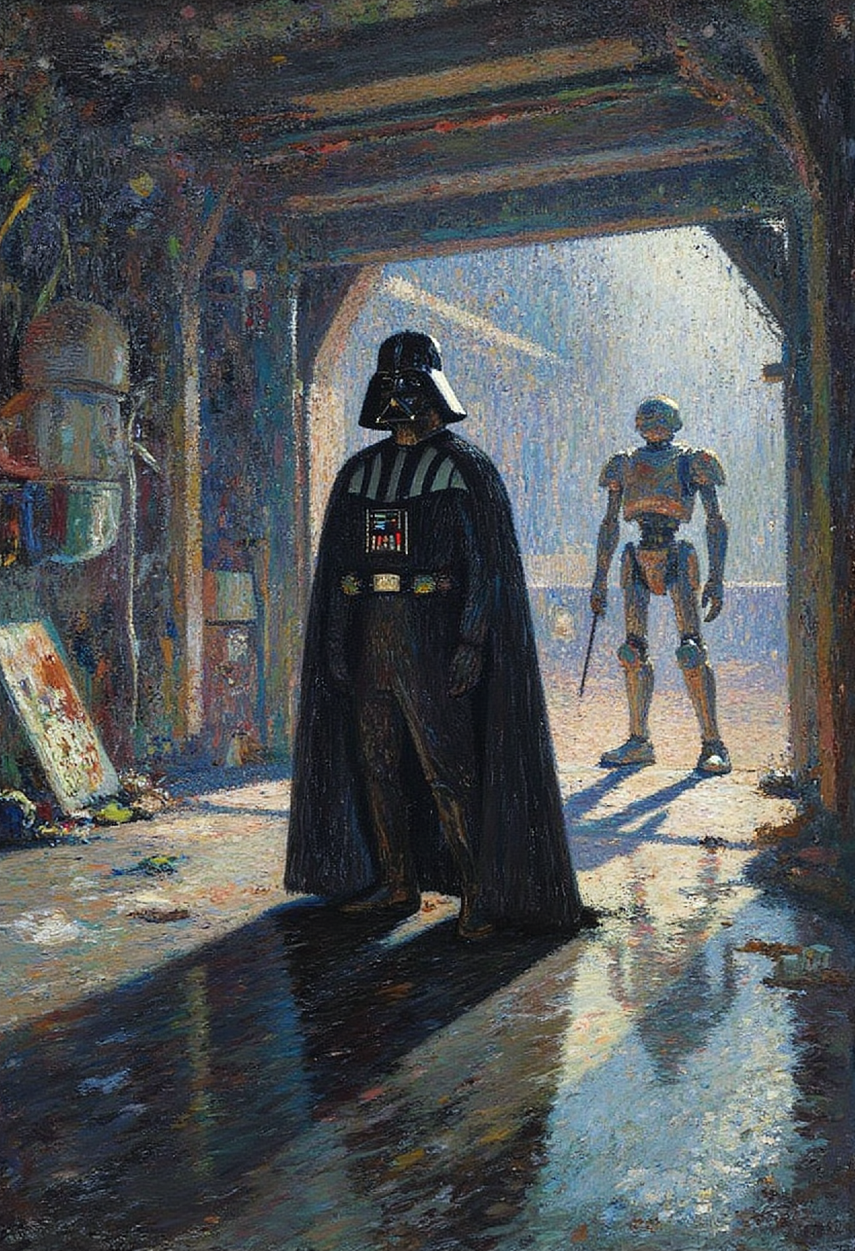 henrimartin1 painting, Darth Vader in a reflective space station hangar, surrounded by a robot and detailed machinery, complex atmospheric perspective