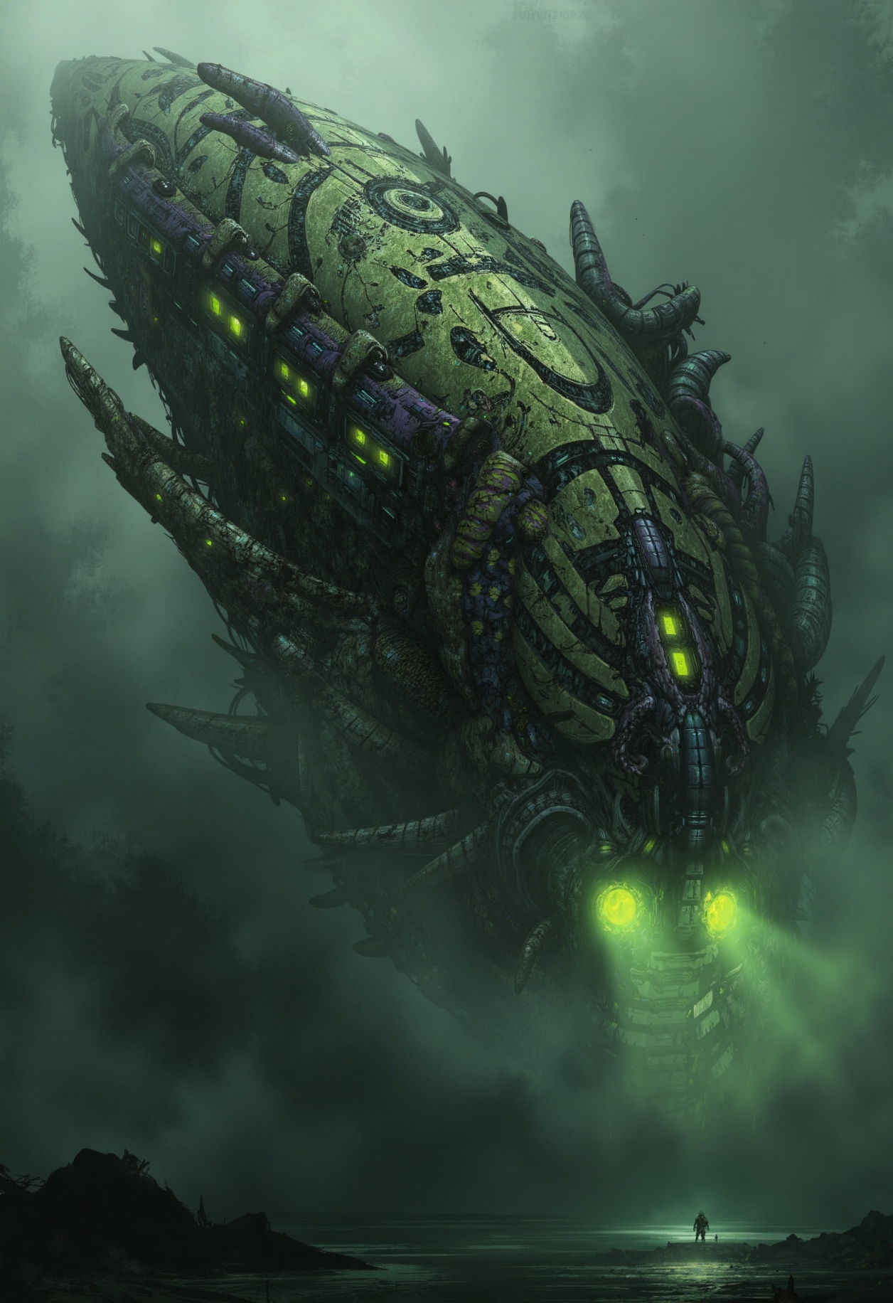 A digital painting in the style of ck-js, depicting a colossal, grotesque alien invader mothership with a biomechanical structure resembling fused chitin and corrupted flesh, drifting silently above a murky, methane-rich gas giant. Its surface is a disturbing texture of jagged, overlapping plates in dark, oily greens and deep purples, with pulsating sickly yellow-green bio-luminescent lights emanating from vents and orifices. Unsettlingly organic weapon systems seem grown into the hull. Focus on the immense scale of the lone, nightmarish vessel, its truly alien biology, and its deeply menacing presence.