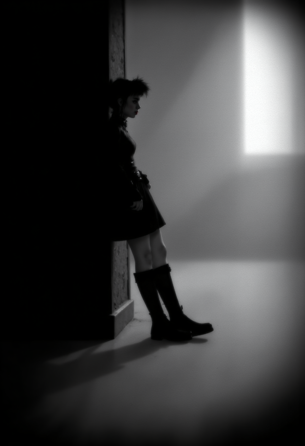 an illustration of a punk woman leaning against a wall in a a dark, shadowy room, misty gray background, in the style of limbo
