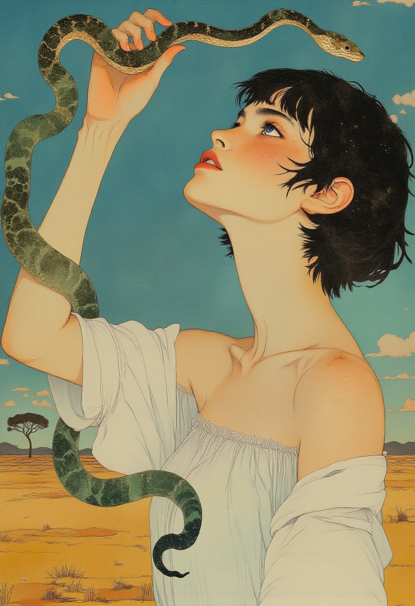 Illustration by Akiya Kageichi. It shows a woman with a modern short haircut with a fringe. The woman stretches a magnificent big jade snake far into the air to show it off, reminiscent of the well-known film scene from The Lion King. A savannah landscape can be seen in the background. wShe has light-coloured skin with light freckles on her cheeks and nose, giving her a youthful appearance. She has a delicate, almost ethereal appearance with large, expressive blue eyes and a slight blush on her cheeks. She wears a simple, off-the-shoulder white top that exposes her shoulders and upper arms, which are slender and smooth. Her facial expression is pensive, with a slight furrow on her brow and a gentle, almost wistful gaze directed at the snake. The snake looks curiously and surprised at the viewer. The overall composition is both elegant and mysterious, evoking a sense of ancient mythology or fantasy. shanshui, Art by Akiya Kageichi