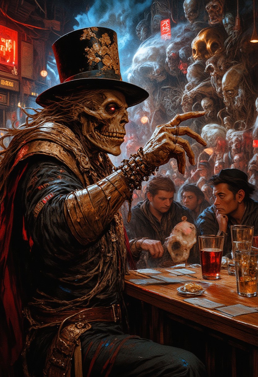 At a local dive bar, the Corpse Burner shares tales of the crypt with fascinated patrons. His skull hat and glowing eyes captivate the audience, his rockabilly vibe setting him apart as he gestures with a studded bracelet-adorned hand., in the style of the decaying empire of Würstreich, dark magic and grotesque creatures abound, inspired by Sean Aaberg's punk aesthetic, dark fantasy world combines grim landscapes with vibrant, exaggerated colorful art, heroes skirmish monstrous foes in a setting where rebellion, decay, and mysticism intertwine, crafting a unique, immersive vibe , dramatic style of Thomas Gainsborough