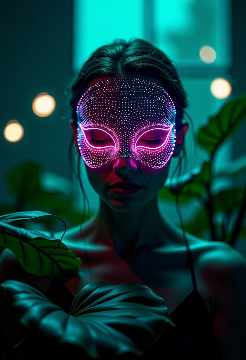 A digital painting in Gothic-inspired surreal fantasy style by a visionary artist, mid-shot composition. A beautiful feminine figure faces forward, head slightly bowed, wearing an intricately crafted mask covered in glowing neon dots and lines that trace organic, flowing patterns. The palette shifts through 16 prismatic colors—neon violet, emerald, ruby red, bright cyan, luminous gold—radiating soft pulses of light. Peace lily leaves frame the mask with elegant curvature, their smooth, waxy surfaces catching highlights and casting fluid shadows across the figure’s softly lit face. The glow from the mask subtly outlines the edges of the deep green foliage, blending the synthetic and botanical. Behind, a softly blurred, minimalist interior hosts floating orbs of gentle light suspended in midair, evoking a meditative, otherworldly calm. Cinematic lighting with f/1.4 aperture creates shallow depth, enhancing glossy reflections and high-detail surfaces. The artwork merges high-definition surrealism with gothic undertones, emphasizing the contrast between luminous technology and quiet natural beauty.