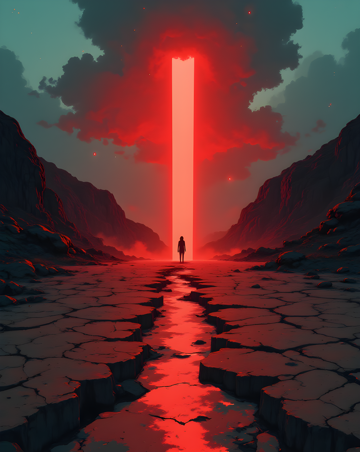 The scene unfolds as a hauntingly surreal landscape, where the ordinary is transformed into something otherworldly. A solitary figure stands at the center of a desolate expanse, their small form dwarfed by the vastness of the environment. The ground beneath them is cracked and barren, its surface etched with deep fissures that stretch endlessly toward the horizon. The terrain is bathed in an intense red glow, emanating from a towering, vertical beam of light that pierces the sky like a luminous pillar. This radiant column dominates the scene, casting an eerie illumination that transforms the surrounding landscape into a sea of crimson hues. The light seems to pulse with life, creating a stark contrast against the dark, jagged mountains that rise on either side of the path. These peaks are shrouded in shadow, their forms blurred and mysterious, adding to the sense of isolation and intrigue. The figure at the center appears distant yet deliberate, their silhouette barely discernible against the overwhelming brightness of the glowing column. They seem to be moving forward, drawn inexorably toward the source of light, as though pulled by some unseen force. The atmosphere is one of quiet tension, a blend of awe and unease, as if this ethereal beacon holds secrets or answers hidden within its radiant core. Above, the sky is a deep, brooding blue, dotted with faint stars that add to the otherworldly quality of the scene. The overall mood is one of mystery and contemplation, inviting the viewer to ponder the journey ahead and the enigmatic purpose of the glowing structure. It is a moment frozen in time, where the ordinary merges with the fantastical, leaving an impression of both wonder and introspection., <lora:FLUX\jul\J_Anime:0.7>, <lora:FLUX\RealAnime:0.7>