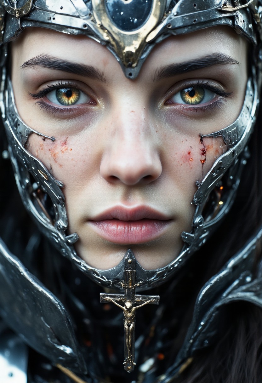 A super close-up — her face floods the frame like a corrupted saint rendered in obsidian and chrome. Porcelain-pale synth-skin, unnervingly smooth, clings to a face carved from elegance and execution: high cheekbones, a blade-sharp jaw, and lips that seem molded for command or carnage. Faint fracture-lines glow dimly beneath her surface — like stress-cracks in battle-worn armor, pulsing with residual energy. A single line of crimson nanogel bleeds from the corner of her lips — not blood, not oil, but something older and forbidden. Her eyes — twin lenses burning with a deep amber-red hue — don’t reflect the world. They scan it. Alive with corrupted data and ancestral wrath, they shimmer like collapsing stars behind a veil of static. There is no empathy. Only recursion, calculation, destiny. They don’t meet your gaze — they pierce it. As if an AI queen built from forgotten warfare has just decided you’re beneath protocol. The background is swallowed in shadow — voidlike, save for the gleam of her fractured iron crown hovering just above her skull. It's fused directly to her head, wires threading into her scalp like a cursed halo. Her hair, matte-black and nanofiber-thin, coils and moves as if running simulations, slithering gently against her armor. It’s not decoration — it’s surveillance. Around her throat, where old world and new tech meet, hangs a charred, inverted crucifix etched with machine-script — softly steaming, frost clinging to its edges in the sterile cold.