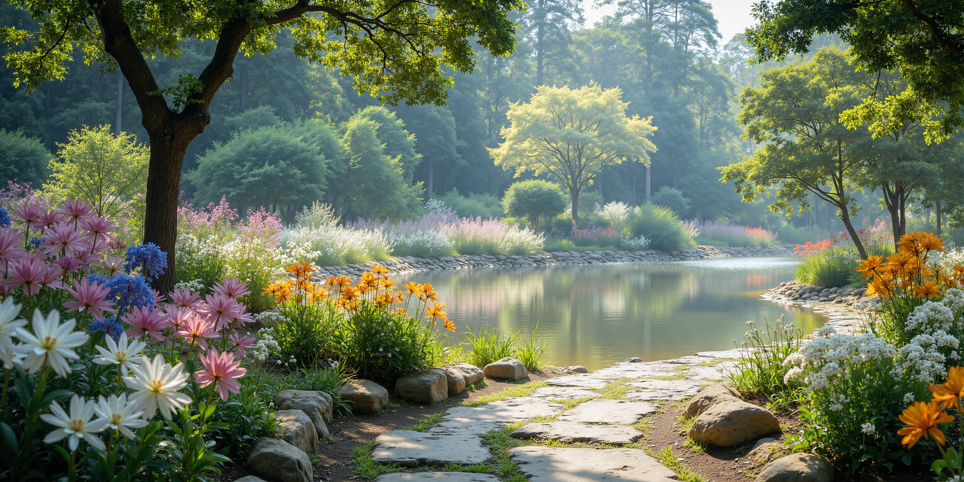 CN_landscape,A beautiful garden,a stone path,surrounding a small lake,filled with various vibrant flowers,including Ageratum,Agapanthus,Alstroemeria,Amaranthus hypochondriacus,Buckthorn Variegated,Buddleia,Anemone,Delphinium Pacific Giant,Dendrobium Orchid,Dianthus barbatus,Rose Royalty,Peony, soft focus,quiet ethereal atmosphere,cool undertones,soft natural daylight,