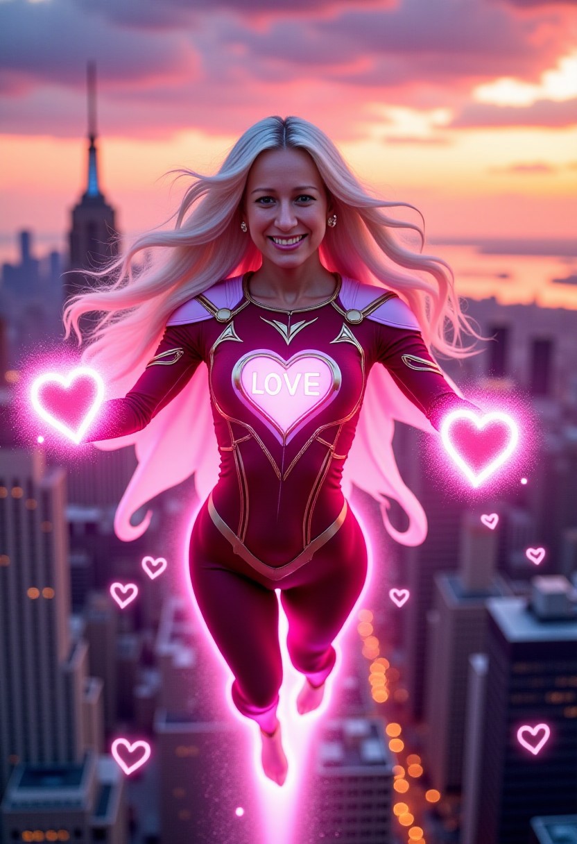 Lizalove, beautiful woman. Masterpiece. long white Malvinka hair with plaits and plaits from the central strands, realistic charming blue eyes. She with a captivating smile that reveals her perfectly aligned teeth looks directly at the viewer. A stunning female superhero soaring through the sky above New York City at sunset, wearing a sleek, form-fitting and revealing superhero costume with metallic accents, heart-shaped patterns, and a flowing cape trailing behind her. Her costume features a glowing emblem that reads “LOVE” across her chest, surrounded by elegant heart-shaped designs. She is mid-air, unleashing a burst of radiant, crackling pink and purple energy from her hands, surrounded by a magical aura. A shimmering trail of glowing heart-shaped particles follows her through the sky, enhancing her romantic and powerful presence. Her long hair flows wildly in the wind as she flies above the skyline, with the Empire State Building and glowing city lights below. The sky glows with dramatic orange and purple hues. Heart-shaped sparkles and soft pink light surround her, creating a dreamy, romantic atmosphere. Epic, cinematic composition, dynamic lighting, ultra detailed, 8k resolution, realistic comic book style