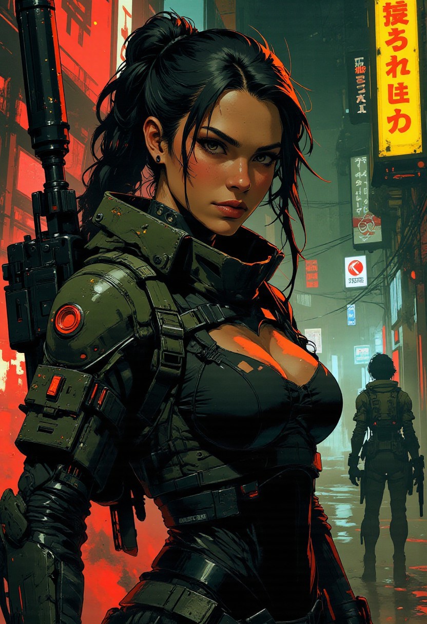 magnificent, closeup portrait, female bounty hunter, braided black hair, futuristic armor, sexy, curvy, large breasts, large ass, a rifle strapped to her back, holstered pistol, Cyberpunk City, Neon Lights, cracking knuckles, Cowboy Shot, close up, from above,