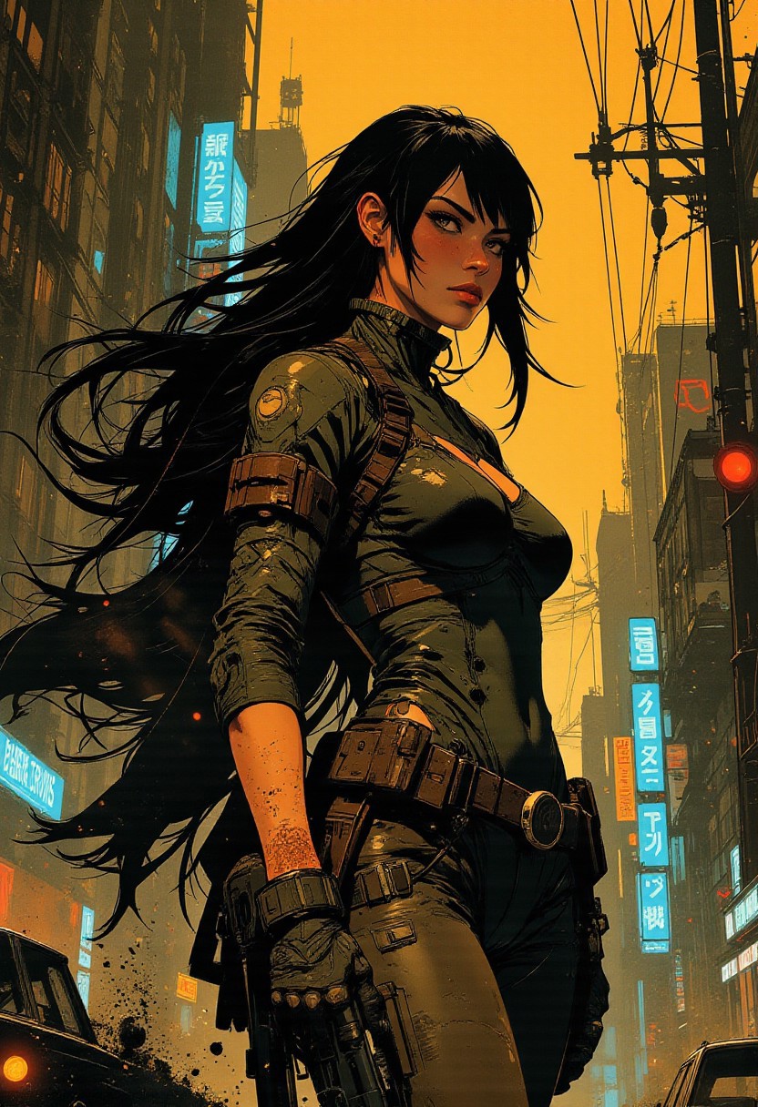 in the style of ck-mgs, nistyle, Inkplash art on rice paper, sepia, henna, Silhouette Art, magnificent, inksplash, closeup portrait, female bounty hunter, flowing black hair, futuristic armor, sexy, curvy, large breasts, large ass, a rifle strapped to her back, holstered pistol, Cyberpunk City, Neon Lights, Cowboy Shot, close up,