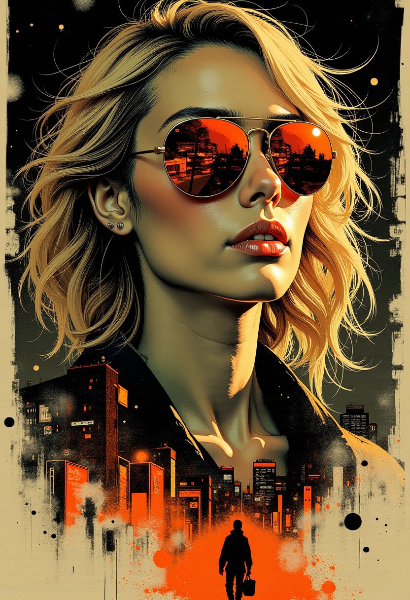 Inkplash art on rice paper, sepia, henna , Silhouette Art, magnificent, inksplash double exposure, crisp lines, Japanese cityscape below closeup portrait of stunning japanese woman, blonde loose hair, mirrorred aviator sunglasses, directional lighting, dark background