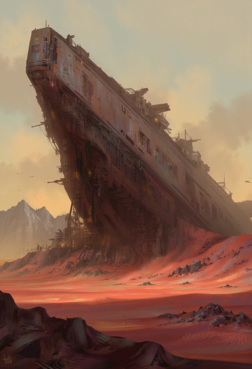 in the style of ck-sfc,, A digital painting in the style of ck-js, A colossal, ancient battleship lies abandoned on a desolate alien world, its rusted hull fractured and weathered by eons of neglect. The barren planet stretches endlessly—cracked, dusty plains under a hazy amber sky, where jagged mountains pierce the horizon like forgotten sentinels. The ship’s skeletal frame, half-buried in crimson sand, tilts precariously, its once-imposing gun turrets now skeletal and silent. Faded insignias cling to peeling metal, and shattered viewports stare emptily into the void. The air shimmers with heat, casting elongated shadows as a dying sun dips low, bathing the scene in hues of tarnished bronze and ashen violet. Craters scar the land nearby, hinting at a cataclysmic battle lost to time. The only movement is the whisper of dust devils spiraling across the dead horizon, as if the planet itself mourns the ship’s forgotten legacy.