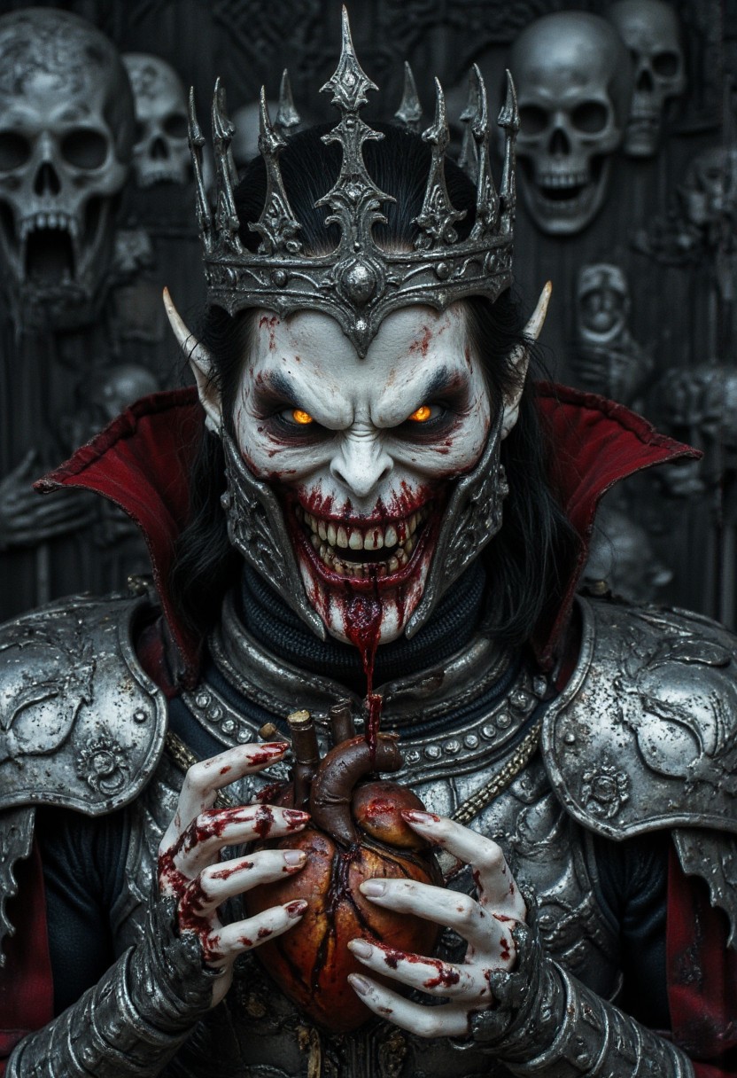 Ultra-detailed Face Closeup portrait of Count Dracula at the zenith of his monstrous glory—a sovereign of blood and shadows. His face is a masterpiece of predatory perfection: razor-sharp cheekbones cutting through the gloom, skin like polished alabaster stretched taut over immortal muscle. Twin hellfire eyes burn with the accumulated malice of six centuries, their crimson glow casting jagged reflections across his (blackened silver pauldrons:1.4). A crown of fused vertebrae and impaled saints rests upon his brow, each bone fragment whispering forgotten curses. His mouth is a wound of perfect violence—lips black as a hanged man's tongue part to reveal fangs that drip with a slow, deliberate venom. The air around him roils with (coagulated blood-mist:1.5), swirling in vortex patterns as if the very atmosphere kneels before him. His armored gorget is carved with scenes of massacres, the grooves packed with centuries-old ash. One gauntleted hand crushes a still-beating heart, its arteries dangling like puppet strings, while the other grips a flayed corpse's spine as a scepter. Behind him, a cathedral of writhing shadows arches upward—ribs of a long-dead god repurposed as his throne. (Screaming faces press outward from the walls:1.6), their mouths sewn shut with his hair. The floor is a mosaic of shattered holy symbols, each fragment grinding to dust beneath his boots. This isn’t a king—this is the reason graves have locks.