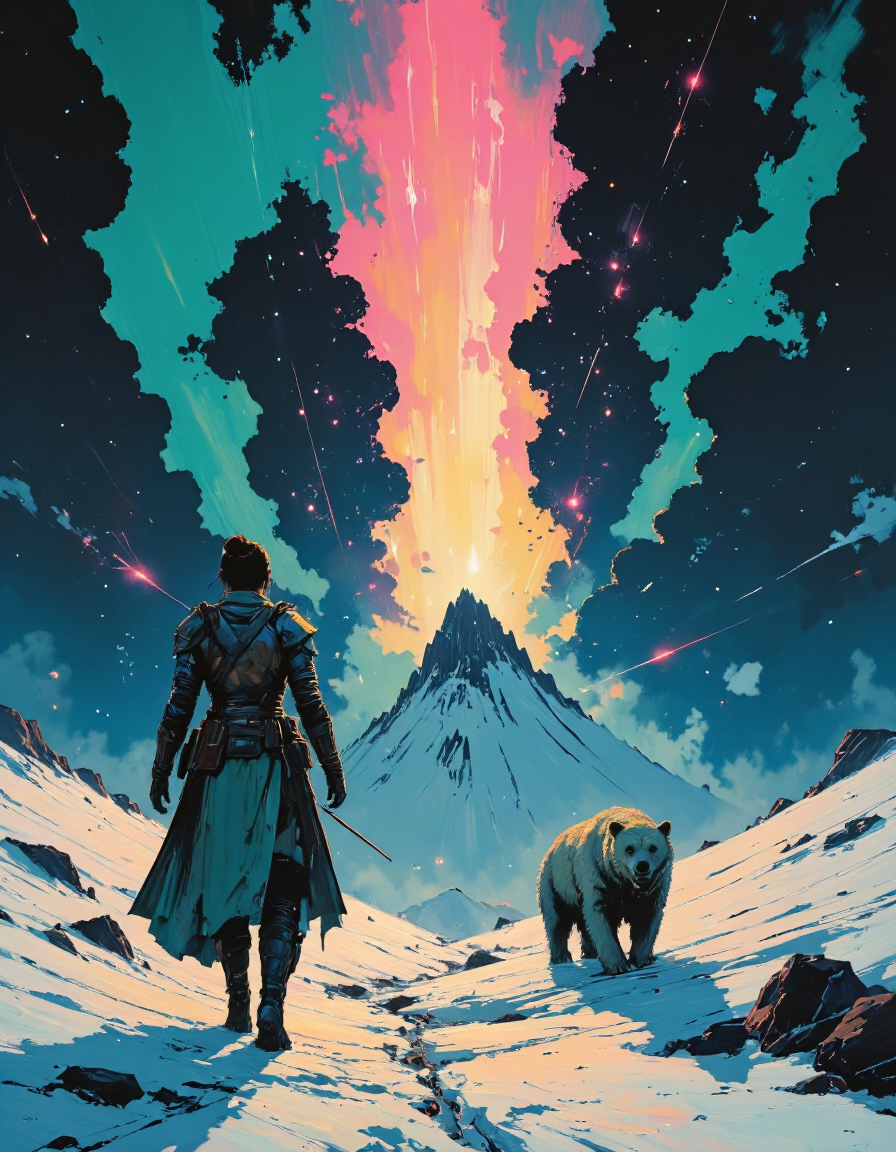 A lone warrior woman in a silver-blue armored dress, trekking through a frozen tundra with a gentle polar bear at her side. The northern lights blaze above in neon pink and turquoise, casting an otherworldly glow on the snow. Ice crystals float in the air, ultra-high detail, fantasy digital painting, vivid colors.