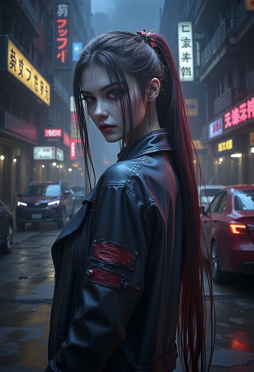Hyperrealistic, cinematographic photography, vivid colors, and intricate details. A beautiful assemblage of a female creature with long, stringy hair. The figure has intense eyes, perfect eyes, building, motor_vehicle, science_fiction, city, car, road, leather jacket, street, cyberpunk, standing in a dimly lit urban street at night. The background features tall buildings with neon signs, and a few cars parked along the street. The lighting is dramatic, with a hazy, misty atmosphere. The overall mood is mysterious and cyberpunk. ahx