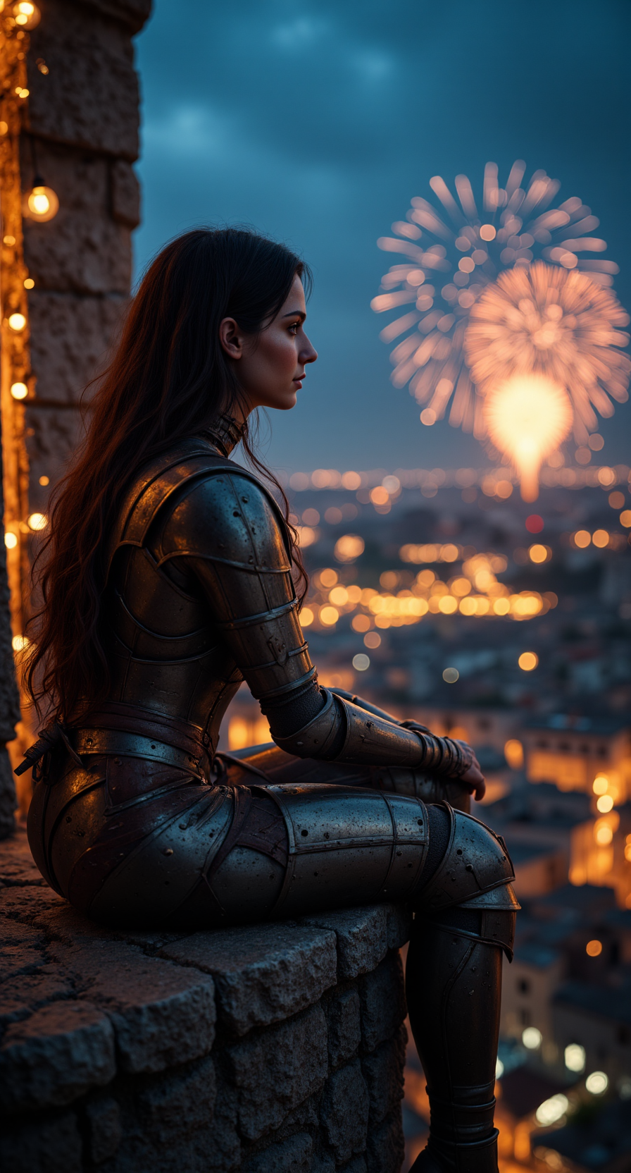 a woman sitting on a high balcony at night, her armor partially removed, watching fireworks over a distant city — photorealistic, soft bokeh, romantic and reflective fmlas-mk.1, R3alisticF