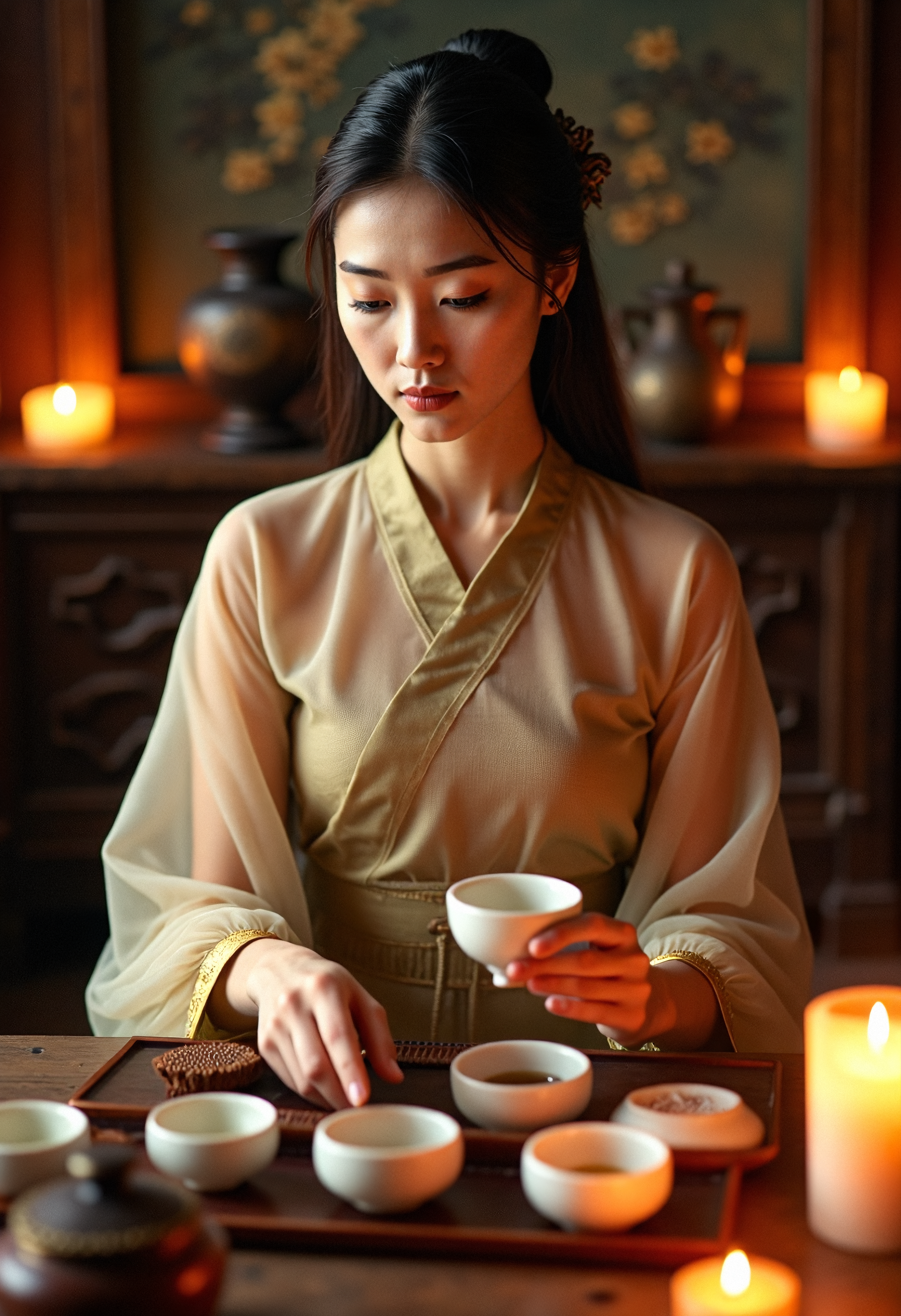 Documentary photography, East Asian woman, sheer hanfu sleeve and golden bangle, jasmine tea pouring into porcelain cups, kneeling beside low table, medium shot, low angle, candlelit tea room with sandalwood censer, quiet contemplation, diffuse candlelight, warm amber tones, Fujifilm X-T4, in the style of National Geographic cultural portraits, perfect detailed face, perfect detailed eyes, perfect hands, perfect feet, natural anatomy, <lora:Flux\Dever_Flux_Enhancer.safetensors:0.5>.