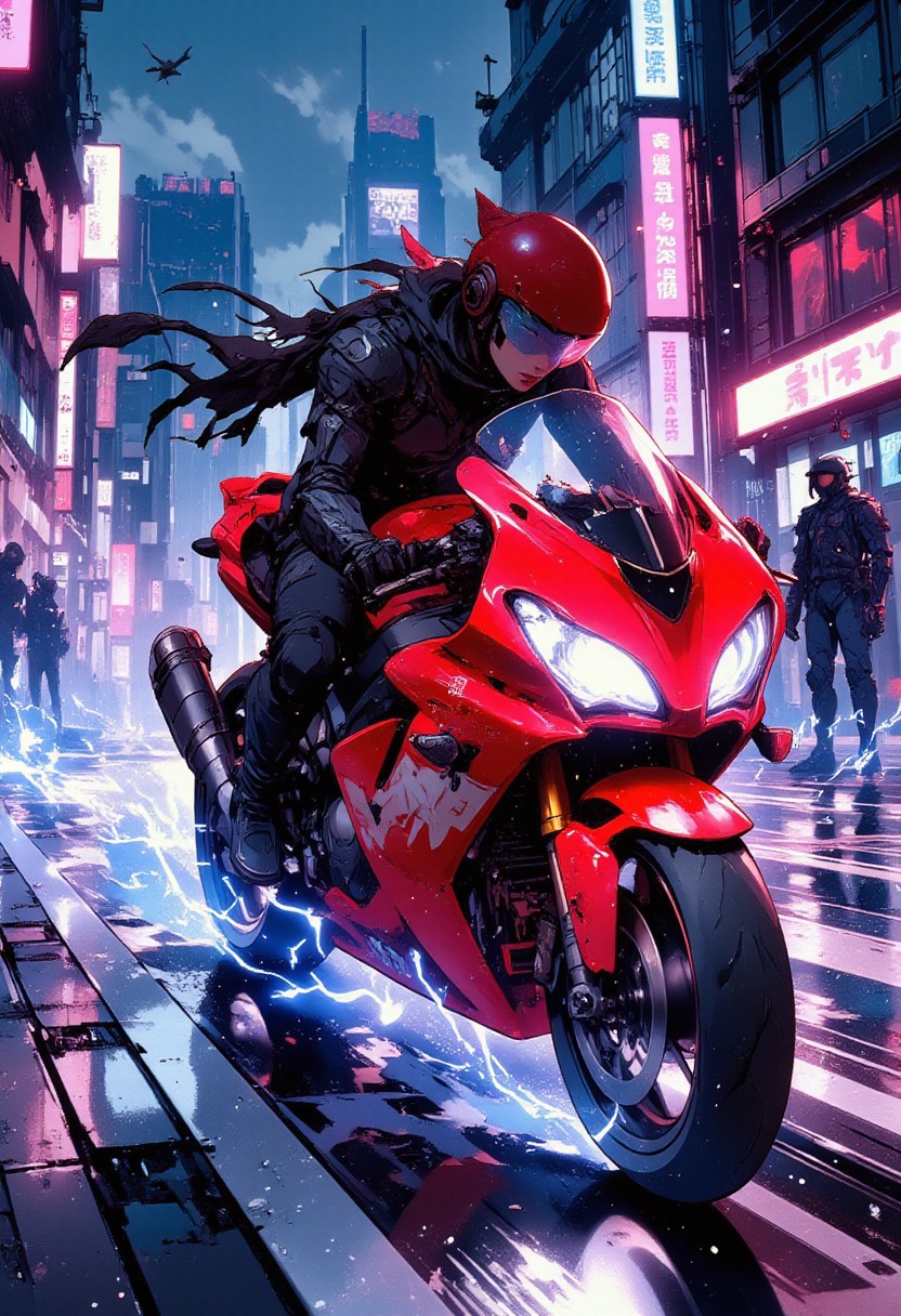In the style of ff-td, Special Ink-drawing mode, Mh1$AgThS2, intricate linework with expressive contrasts, stunning anime, illustration of a Japanese goth man, dramatic facial features, wearing a sleek red futuristic helmet with aerodynamic fins, glowing circuit-like patterns, tinted visor reflecting neon lights, black leather outfit with red accents, riding an Akira-style futuristic superbike, long dragster-style red bike with aggressive sports fairing, racing at extreme speed through a neon-lit futuristic city, cyberpunk skyline, glowing holograms, high-tech skyscrapers, reflective wet streets, vibrant signage, electric cables overhead, subtle vaporwave color tones, purples, pinks and blues blending in the background, ambient rain with light reflections, raindrops on camera lens effect, neon glow cutting through the mist, flying surveillance drones in the sky, futuristic police officers in armor patrolling, high-speed chase energy, dark energy aura surrounding the rider with crackling blue lightning, energy trails streaking from the bike, dynamic motion blur on the wheels and background, road and lights warping from speed, cinematic composition, intense atmosphere, masterpiece, best quality, ultra detailed, highres, absurdres