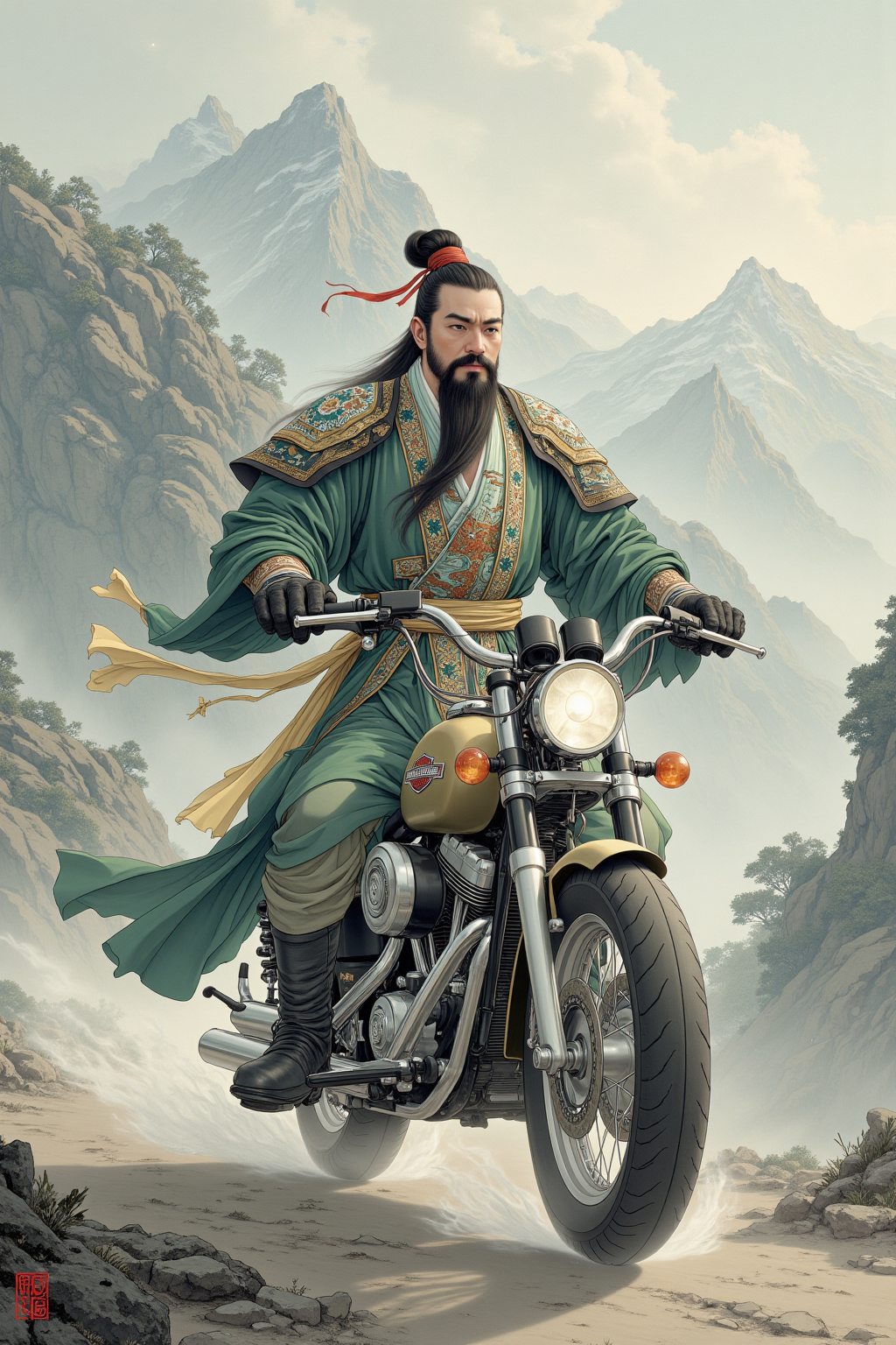 Ancient Chinese general Guan Yu,majestic and stern,wearing ornate green robes with golden embroidery,long flowing black beard,red face symbolizing loyalty,holding a massive Qing Long Yan Yue Dao (Green Dragon Crescent Blade),standing in a heroic pose amidst misty mountains,traditional ink painting background,hyper-detailed,realistic lighting,vibrant colors,intricate armor patterns,Chinese dynasty aesthetic,dramatic atmosphere,(Riding a Harley-Davidson motorcycle, speeding down the mountain trails, with a sporty line.:1.2),