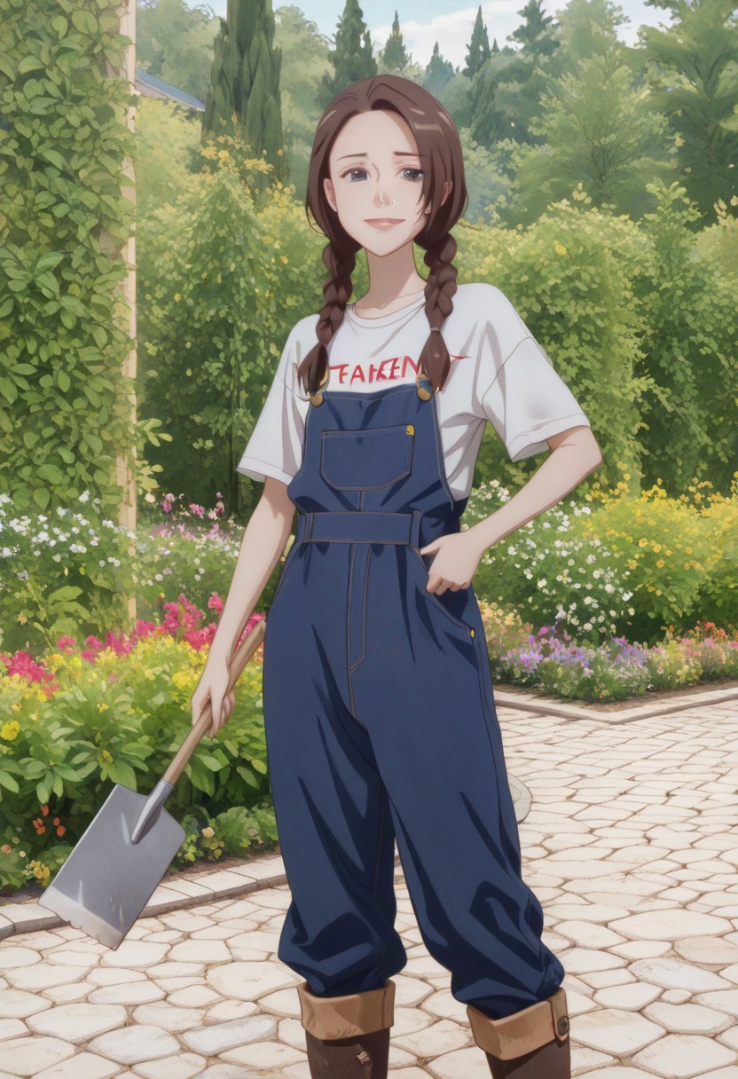 masterpiece, best quality, amazing quality, very aesthetic, absurdres, anime_recap, newest, 1girl, 18 yo, solo, cute girl, half smile, focused, girl focus, perky breast, tattered t-shirt, petite body,two thick braids, overalls, farmer boots, holding showel, garden background,