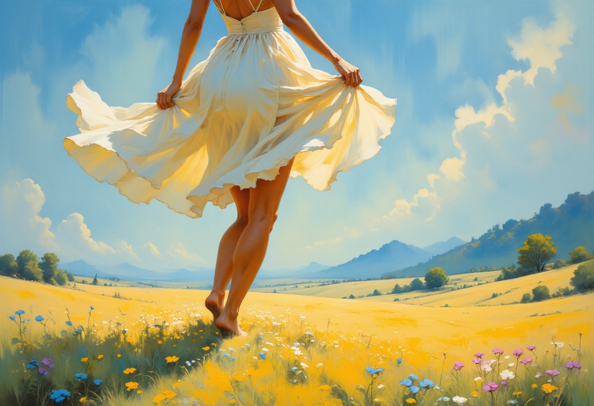 A close-up from behind, capturing just the curve of her thighs and the soft arch of her back as she walks through the summer meadow. The camera focuses on her legs, which are slightly parted, her thighs toned and glistening under the gentle sunlight, the soft fabric of her skirt blowing in the breeze. The wind lifts the hem of the skirt just enough to reveal a hint of delicate lace at the edge of her slip, a subtle yet alluring detail that catches the eye. The light pastels of the meadow blend softly with her skin, with the faint pinks and blues reflecting in the quiet beauty of the moment. Her back, slender and smooth, arches ever so slightly with each graceful step, the sun casting a warm glow over her skin. In the background, the sky is a perfect summer blue, with fluffy, distant clouds, as though the world is watching in peaceful silence. The focus is entirely on her form—the delicate curve of her back, the graceful bend of her legs, and the way the wind interacts with her clothing, evoking a sense of freedom and natural beauty. The scene is quiet, intimate, and sensual, without needing to show more—just the suggestion of something beautiful and alluring in its simplest form.