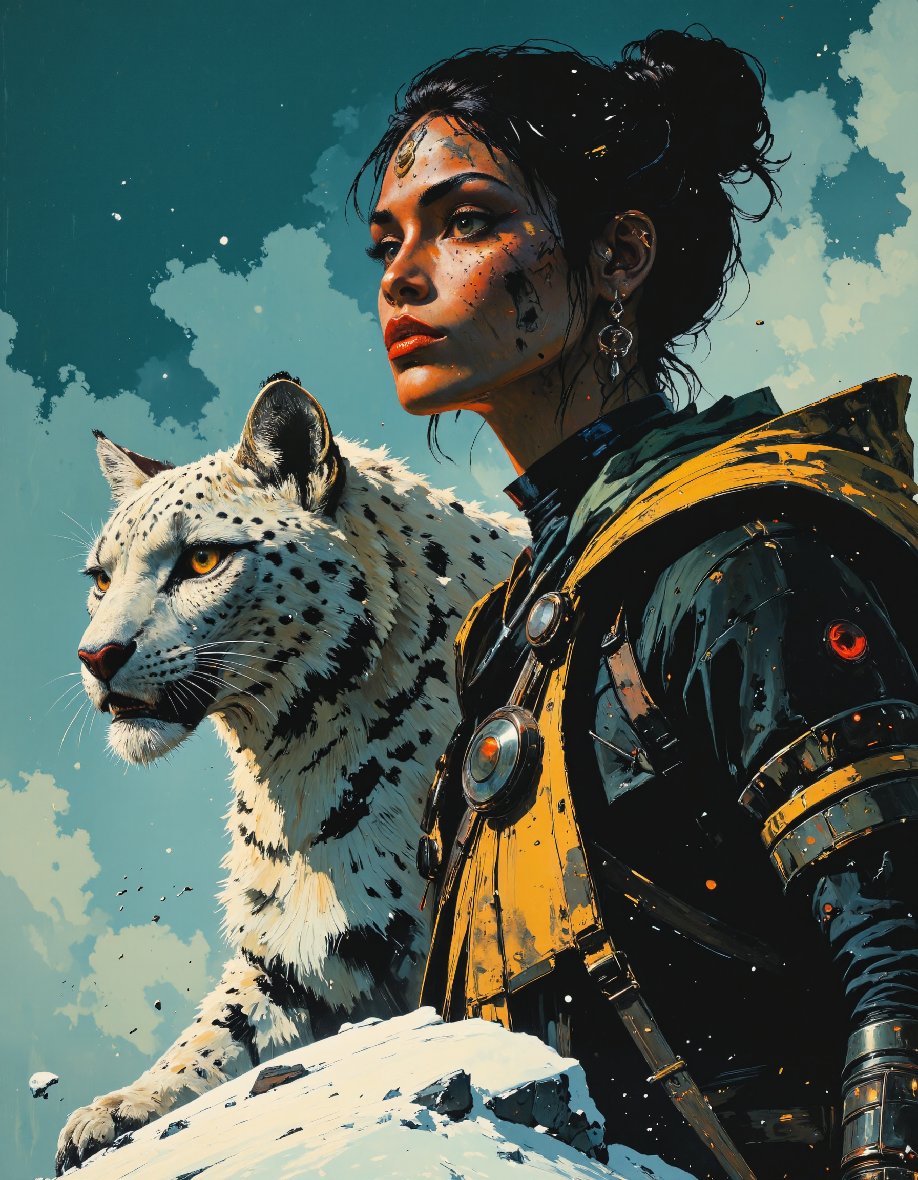 A fierce warrior woman with intricate tribal face paint, wrapped in furs, standing on a snowy mountain peak with a majestic snow leopard, icy blue and gold tones, hyper-realistic, cinematic lighting.