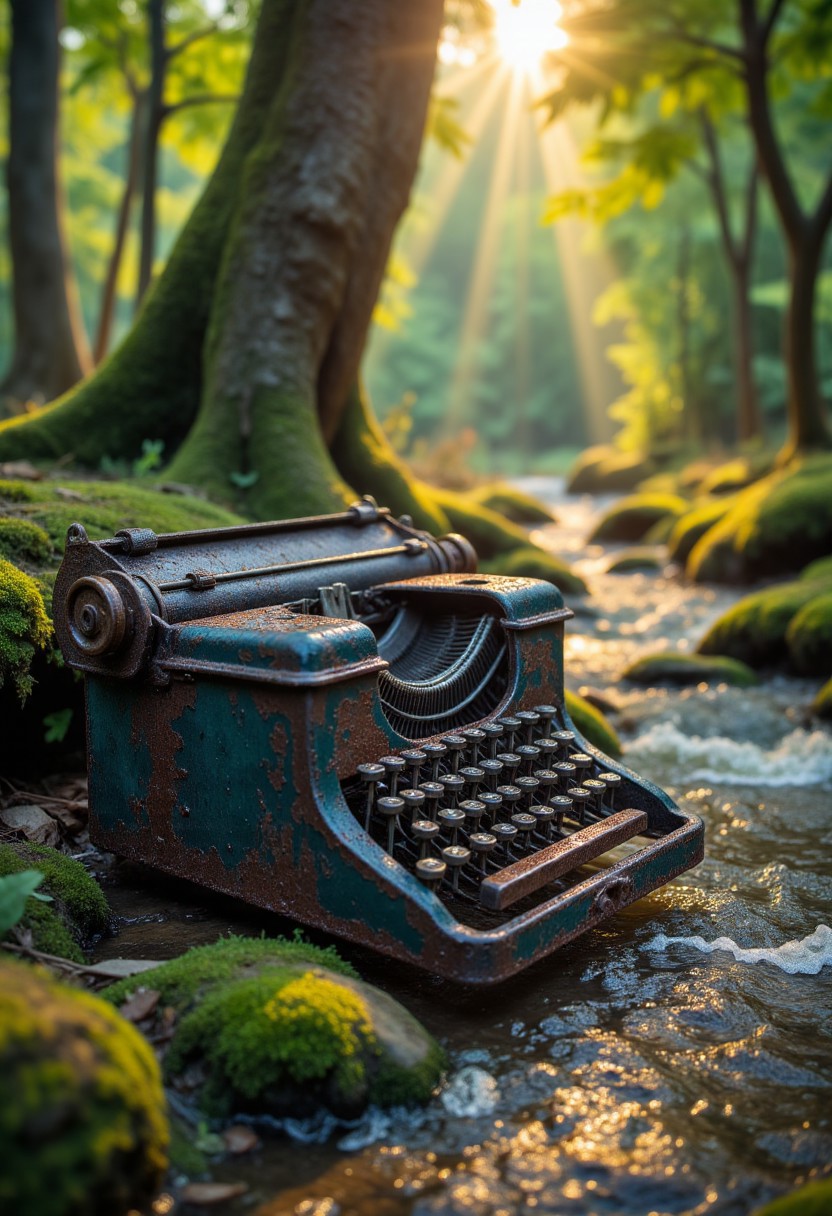 A lifelike image of a vintage typewriter submerged halfway in a moss‑covered forest stream, its keys rust‑flecked but intact, droplets clinging to the metal, while soft sunlight filters through ancient trees overhead. , aidmamjv7, aidmaHyperrealism