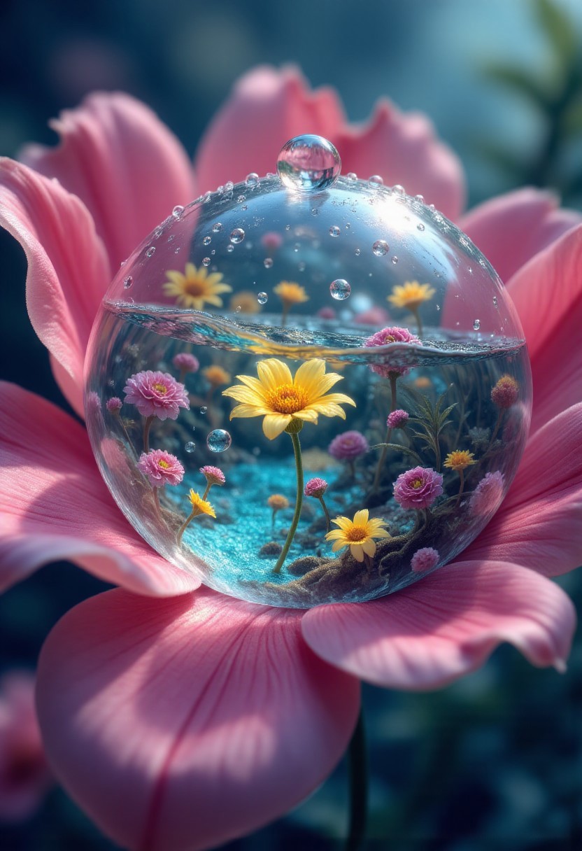 macro photo, raindrop on a petal, inside a tiny underwater scene, high detail, whimsical and intricate , aidmamjv7, pinkfluxproultrafantasia