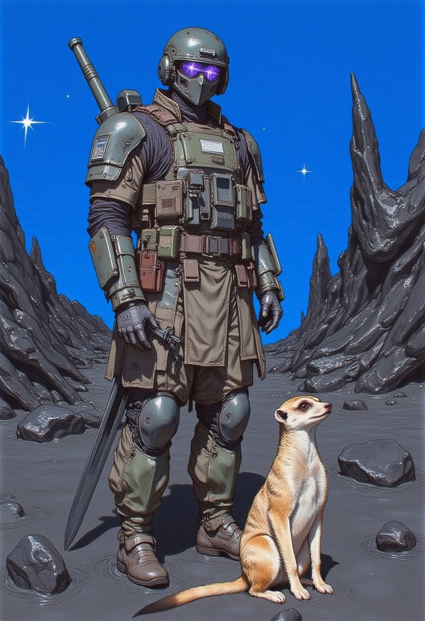 pingtu style, illustration-fen, niji, gothic, erotic, anime, water color on rough paper, hard colors. A Jin roh wolf brigade soldier stands rigid in full tactical gear, mask sealed, glowing eyes piercing through the still desert air. The armor is portrayed with textured layering, each plate defined by thick expressive strokes, capturing weight and oppressive utility. Beneath him, black sand sweeps in uneven ridges, interrupted by jagged black rock formations rising like scars. The sky above is a saturated blue, violently clashing with the terrain, scattered with gilleting stars rendered in sharp silver flecks. Light fractures across his visor, distorting the glow. At his side, a meerkat sits on the sand, alert and still, eyes locked toward an unseen presence in the distance. The rough paper surface amplifies the rawness of the scene—wind suggested by angled streaks, dust rising in coarse sepia and gray smears. The contrast between the soldier’s mechanical form and the organic stillness of the meerkat suggests tension and silent narrative. The figure's shadow stretches behind him like a blade.