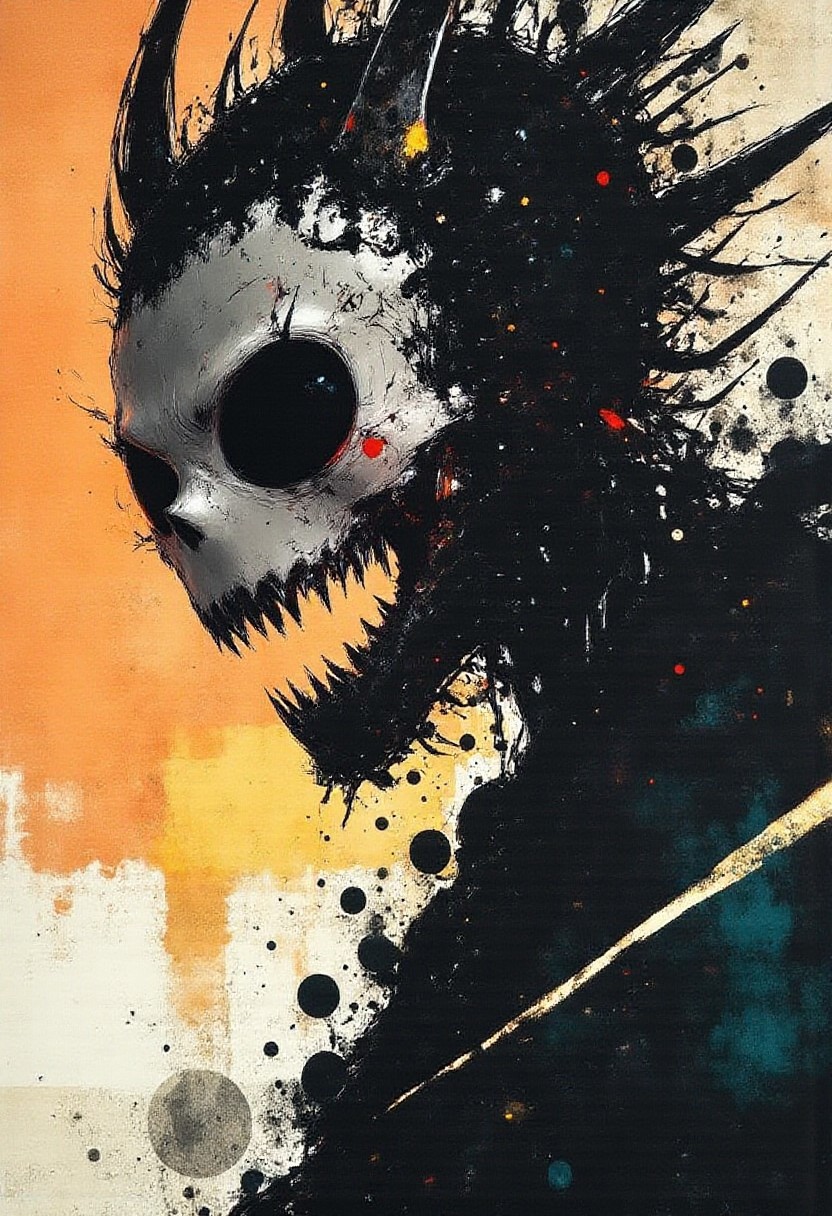 an adroit d3press1on illustration, in the playful scribble drawing style. triadic complementary colors, dark and moody surreal nightmare of an eerie laugh, a mouth distorted, wide grin, and full of sharp nails, in the realm of the damned dreaded souls, teal and orange color grading, yellow abstract geometric gradients stain the orangish background