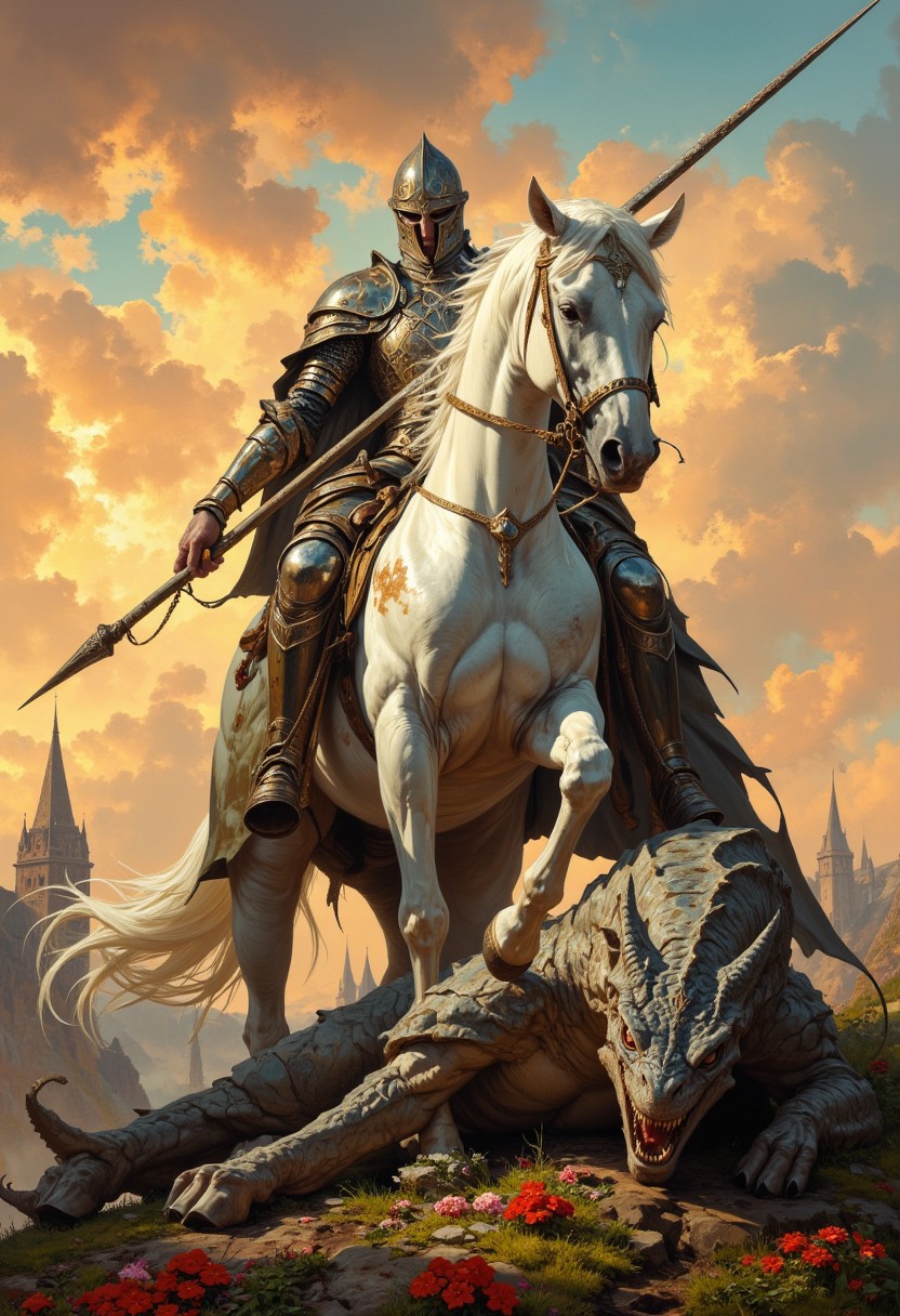 score_9, score_8_up, score_7_up, 8k high quality digital painting, masterpiece, very detailed, ultra realistic, (best quality) very detailed epic masterpiece, boris vallejo style, frank frazetta style, retro artstyle, full body, fairytale-like, realistic detailed oil painting style Rembrandt style, Vermeer style, heroic fantasy, realistic, realism, a knight on a white horse impales a dragon with his large lance, which lies on the ground beneath the horse. The dragon hisses aggressively. The horse's impressive epic posture is striking. A beautiful fairytale landscape with colorful flowers is depicted. The setting sun casts long shadows. Warm golden evening light. Magical atmosphere. action, movement, full body