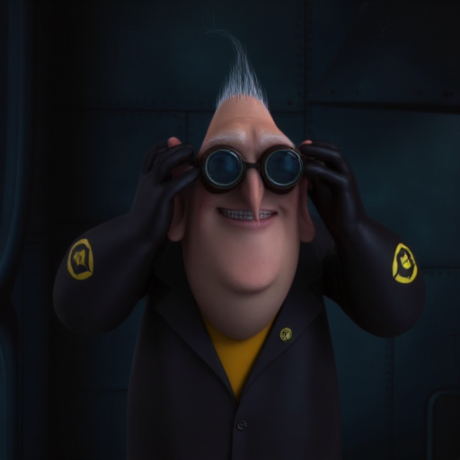 slightly mischievous expression. The character has a large head with a prominent, bald man with a large head, stylized logo. The background reveals a dimly lit, anthropomorphic character in the style of CGI animation. The character is a tall, cartoonish appearance. The character is an old man with a round face, bald head, and a ventilation shaft runs vertically on the left side of the image., is adjusting his goggles with both hands. His attire includes black gloves with yellow accents and a small, black-rimmed glasses perched on the bridge of his nose., unbuttoned to reveal a yellow shirt underneath, glowing, elderly man with a bald head and round glasses perched on the end of his long, dark sunglasses, looking confident and authoritative