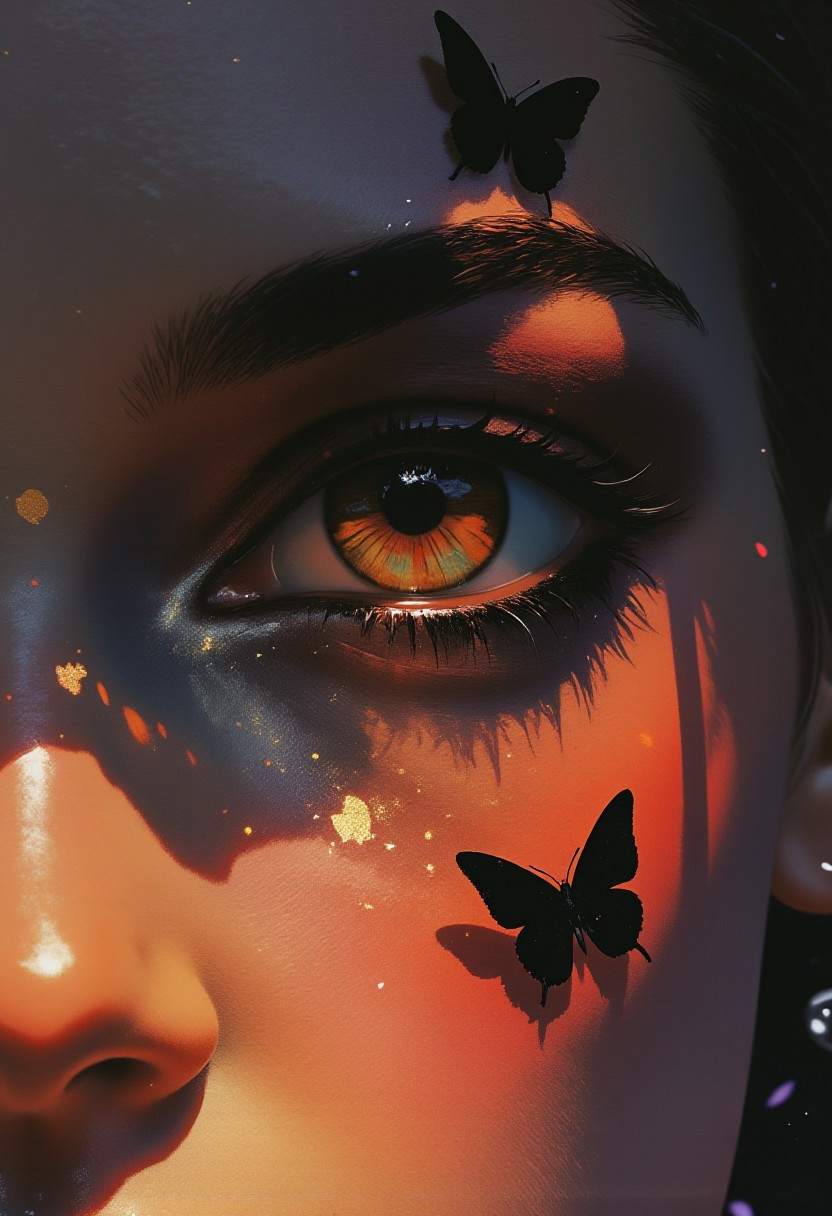 (hyper-realistic photograph, extreme detailing) A striking close-up of a single eye, the focus sharp and intense. The iris is a mesmerizing amber, almost luminescent, with intricate golden striations, while the pupil is a deep obsidian black, creating a dramatic contrast. The eyelashes, thick and delicately curled, shimmer in a rich midnight purple hue, standing out against the surrounding skin. The skin is a warm, deep bronze with extreme pigmentation, adorned with a constellation of dark freckles across the cheek and brow, adding depth and a natural, imperfect beauty. Around the eyes, bold makeup is applied in dark, dramatic shades, with heavy eyeliner accentuating the sharp, captivating gaze. Black butterfly stickers are placed around the cheeks, each one intricate and delicate, their wings adding a touch of whimsy to the otherwise fierce and powerful look. The background is an ethereal blend of smoky charcoal and soft violet, subtly fading into an inky black at the edges, creating a dramatic, cinematic depth that complements the subject's intense gaze. The interplay of light and shadow emphasizes the intricate textures of the skin, lashes, and makeup, capturing the bold contrast of the vibrant tones. The composition radiates raw emotion, blending beauty with a sense of mystery and allure, creating a hyper-realistic portrayal that commands attention.