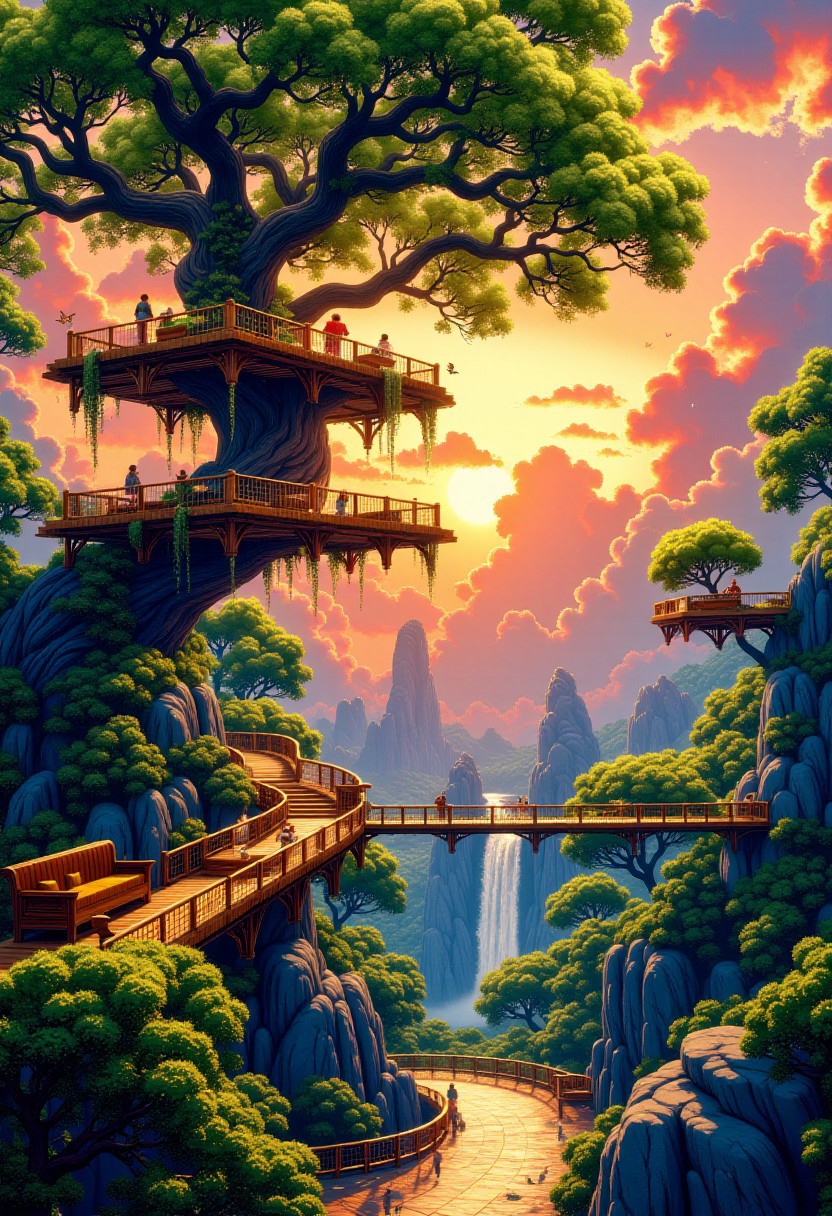 The Verdant Astral Canopy A hovering treetop garden, woven into the branches of an ancient celestial tree, its leaves shimmering with iridescent green and amber light. The sky is a swirling gradient of burnt sienna and ethereal lavender, casting dappled golden light onto suspended wooden terraces, connected by hanging rope bridges wrapped in soft, glowing vines. The Gravity-Warped Garden of Infinite Reflections A dreamlike garden suspended in the void, where plants grow upside-down, twisting into endless spirals of glowing leaves and luminescent petals. Mirrored waterfalls, flowing upwards, reflect an infinite sky filled with swirling magenta and teal auroras. The ground shimmers with a grid-like tapestry of moss and golden circuitry, pulsing in sync with the soft, ethereal beats of otherworldly synth music. The air is thick with the scent of honeyed citrus, wild mint, and warm stardust, creating a feeling of cosmic serenity. Holographic butterflies flutter around floating bonsai planters, while the scent of crushed sage, damp soil, and sun-warmed citrus leaves lingers in the cool breeze. Beneath the canopy, murals of biophilic art depict ancient myths of star-born deities, etched into smooth, vine-covered stone slabs.