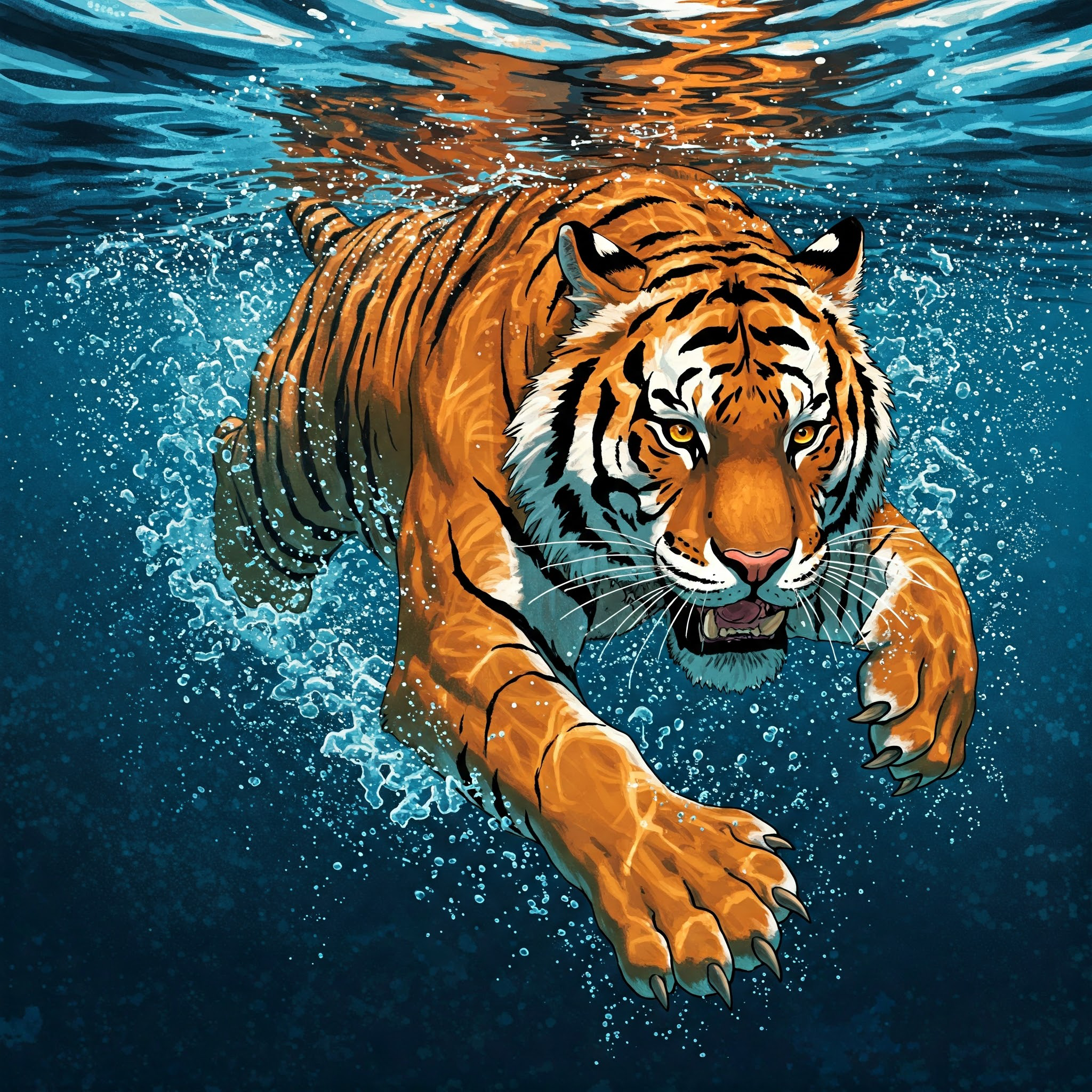 a majestic Bengal tiger mid-leap in an underwater action scene, captured from below the surface as it dives into a crystal-clear, dark blue pool, dynamic comic-style illustration, dramatic motion lines, hyper-realistic anatomy, intense facial expression, glowing water particles, cinematic lighting, highly detailed splash effects, bold inking, vivid colors, stylized shadows