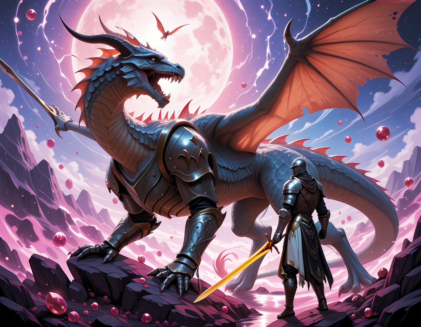 masterpiece, best quality, highly detailed, ultrarealistic, fantasy portrait photography, beautiful eyes, ethereal beauty, magical atmosphere, whimsical element, enchanting composition, mystical storytelling, professional lighting, imaginative concept, creative styling, otherworldly aesthetic, fantasy romance, surreal visual, enchanting character, captivating narrative, intricate detail, vibrant color, fantastical landscape Fantasy game concept art on solid color background, game item design, detailed and painterly style, focus on fantasy elements, attention to texture and additional elements like, suitable for video games or animation, 1boy, knight, tattered_armor, holding_sword_upward, steel_sword, leather_hilt, gemstone, striking, 1creature, dragon, large_green_dragon, flying_above, from behind, cinematic_shot