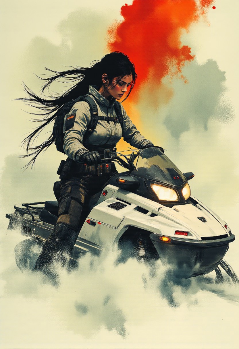 nistyle, mwv7_alpha_v01, ArsMJStyle, Expressive Watercolor Ink Wash, Inkplash art on rice paper, sepia, henna , Silhouette Art, magnificent, stunning japanese woman, long flowing hair, sidelocks, dark eyeshadow, white and grey camouflage armour, riding snowmobile