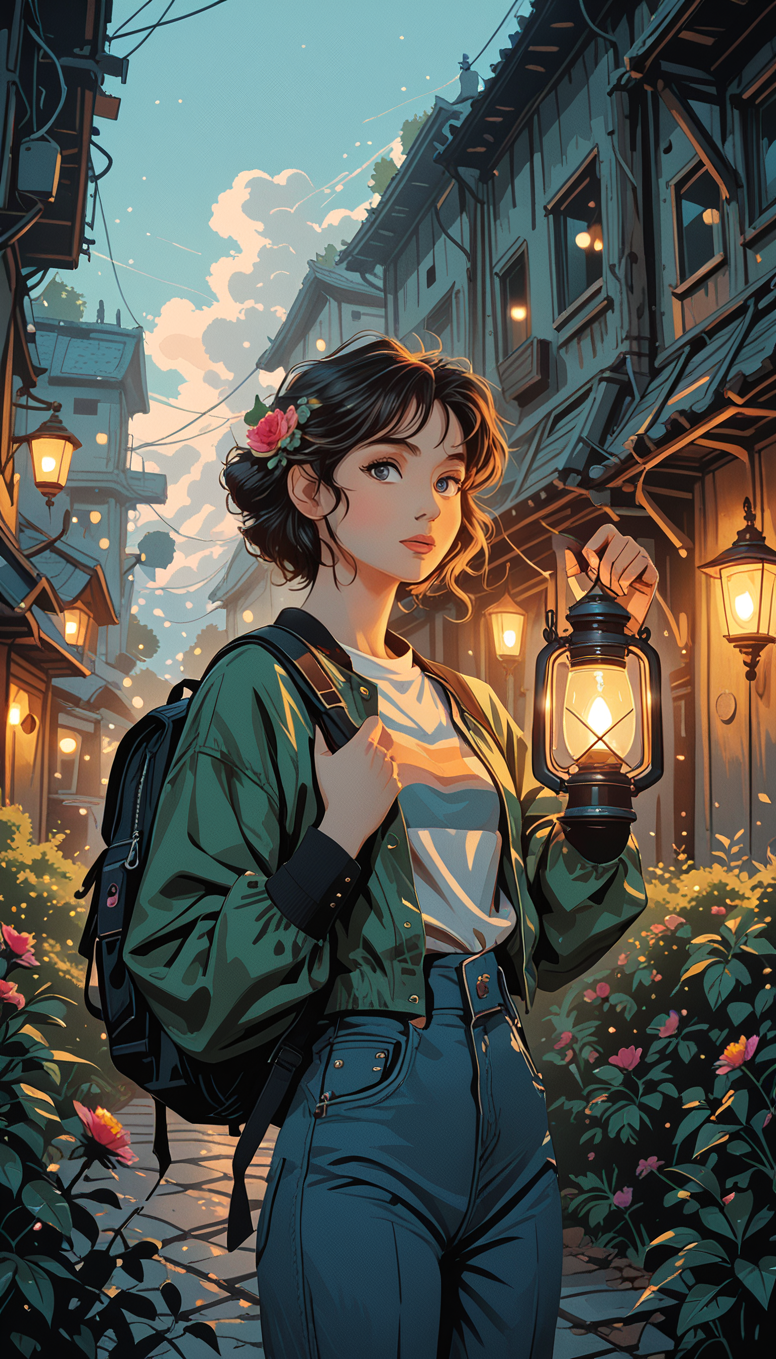 masterpiece, Shinkaistyle, pinkretroanime, retro art, Cyberpunk Style, cyberpunk, science fiction, hi tech, future tech, neon, (Cybernetics:1.25), (Neon Cityscape:1.4), (lineless:1.5), smooth edges, (lighten the face:1.5), tall body, slender body, fit body, long legs, In the heart of a verdant forest, a young girl with flowing brown hair stands as the focal point of the image. She is adorned in a green jacket, a testament to her adventurous spirit, and holds a lantern in her right hand, casting a warm glow that contrasts with the cool hues of the surrounding foliage. The girl's eyes, full of wonder, are locked onto something beyond the frame of the image. Her gaze is directed towards the left side of the composition, suggesting an interaction or encounter with another individual or creature off-camera. Her posture and expression convey anticipation and curiosity, as if she is waiting for a response to her call. The background is a lush tapestry of green foliage, with various shades creating depth and texture. The forest floor is carpeted with fallen leaves and small twigs, hinting at the changing seasons. A large tree stands to the left of the girl, its trunk sturdy and ancient. A clear blue sky forms the backdrop, dotted here and there with fluffy white clouds, adding a sense of tranquility to the scene. The overall atmosphere of the image is one of mystery and adventure, with each element contributing to the narrative of an enchanting encounter in the heart of nature. The girl's position in the foreground brings her closer to the viewer, inviting us into her world and sparking our imagination about what lies ahead on her journey., 1girl, solo, looking at viewer, blush, short hair, open mouth, bangs, blue eyes, skirt, brown hair, shirt, black hair, hair ornament, long sleeves, holding, hair between eyes, closed mouth, standing, jacket, white shirt, upper body, flower, short sleeves, outdoors, parted lips, open clothes, shorts, day, striped, pants, hand up, hair flower, bag, blurry, :o, black eyes, from side, open jacket, tree, sketch, blue skirt, black jacket, looking to the side, grey eyes, hands up, night, depth of field, glowing, leaf, wavy hair, black pants, sunlight, backpack, grass, plant, denim, red flower, t-shirt, nature, scenery, no headwear, light particles, tareme, forest, backlighting, jeans, striped shirt, lantern, blue pants, light, lamp, bush, dark, layered sleeves, short over long sleeves, dappled sunlight, lamppost, holding strap, holding lantern, fireflies, foliage