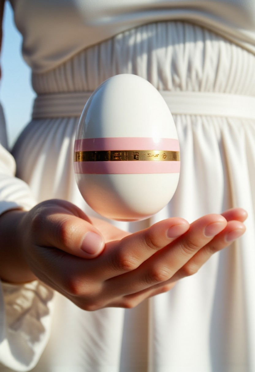 No face. Just a hand—slender, pale, and wrapped in whisper-thin fabric that shimmers like dust in sunlight. It holds an egg. Not painted. Not playful. It is crafted. The shell is smooth, impossibly fine—white porcelain veined with hairline filigree in gold circuitry. Not decoration—function. The egg hovers half a centimeter above her palm, spinning almost imperceptibly. At its equator, a razor-thin band emits a soft pulse—pink fading into white, a heartbeat coded in impossible language. Tiny etched glyphs flicker in and out along the surface, rearranging in real-time, like it’s listening for a question you haven’t asked yet. There is no mouth to smile. No eyes to interpret. Only the egg, its presence somehow watching you in return. Behind the figure: only light. Empty whiteness. Clean. Eternal. Clinical. And as you stare, the glyphs stop. Just for a second. Then rearrange into a perfect mirror of your own name.