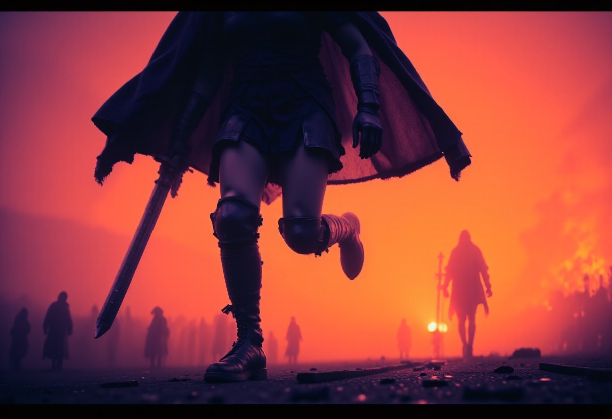 A cinematic side view capturing only the lower half of a female knightess mid-run, frozen in motion. The scene focuses entirely on the space between her high armored boots and the edge of her short, metal battle skirt. Her muscular thighs flex with every stride, the taut, toned skin illuminated by moody, directional light that glints off the polished surface of her armored socks and intricately etched knee-guards. The metal skirt flutters with her movement, momentarily lifting to reveal flashes of inner thigh—smooth, battle-hardened skin framed by the hard, angular lines of her armor. Every detail is alive with motion: the faint ripple of her thigh muscles, the subtle sheen of sweat, and the soft reflections dancing along the metal. Dust and light trail behind her like echoes of momentum, with hints of a flowing cloak barely visible at the top of the frame. The setting is a twilight-lit battlefield, glowing with the orange and violet hues of a distant firestorm, casting long, dramatic shadows and lending a surreal, dreamlike contrast to the sharp, grounded realism of her powerful stride. neon-mist, overexposed