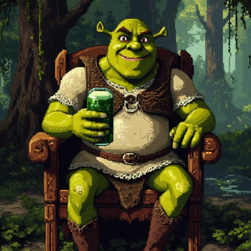 Detailed pixel art in DPAV1.0 style that features Shrek sitting on a chair in his swamp, Shrek smiles and looks at viewer direction, the chair he is sitting on is a comfortable wooden chair. He has his legs crossed and is holding glass filled with green drink full of bubles
