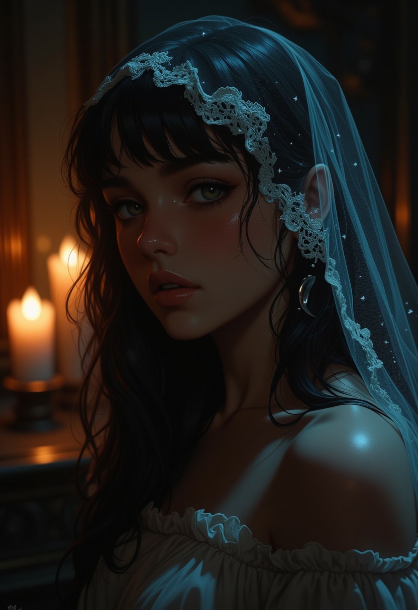 An atmospheric and powerful dark fantasy, natural organic and impressionist classical-style painting of a close-up head and shoulder portrait of a woman in a shadowy, candlelit room. Her face is framed by a delicate, sheer, laced veil that drapes over her forehead and falls to her shoulders, partially obscuring her features but allowing the soft glow of her eyes to shine through. Her eyes are downcast, filled with a hint of sadness, and her cheeks wet with tears that spilled down her from her eyes. Her lips are slightly parted, as if caught in a moment of vulnerability. She wears a silver earring in the shape of a crescent moon, glinting softly in the candlelight, and her long hair flows loosely beneath the veil, cascading over her shoulders. The veil is embroidered with tiny, shimmering stars that catch the light, adding a touch of ethereal beauty. The background is blurred, with hints of soft, glowing candles casting warm shadows over her skin, emphasizing the intimacy and emotional weight of the scene., (((ultra-realistic style))), realistic soft lighting, dark, eye-catching, atmospheric lighting, natural, shallow depth of field, (highlights: 0.8), high detail (dynamic, cinematic shot, film grain, bokeh, depth of field)
