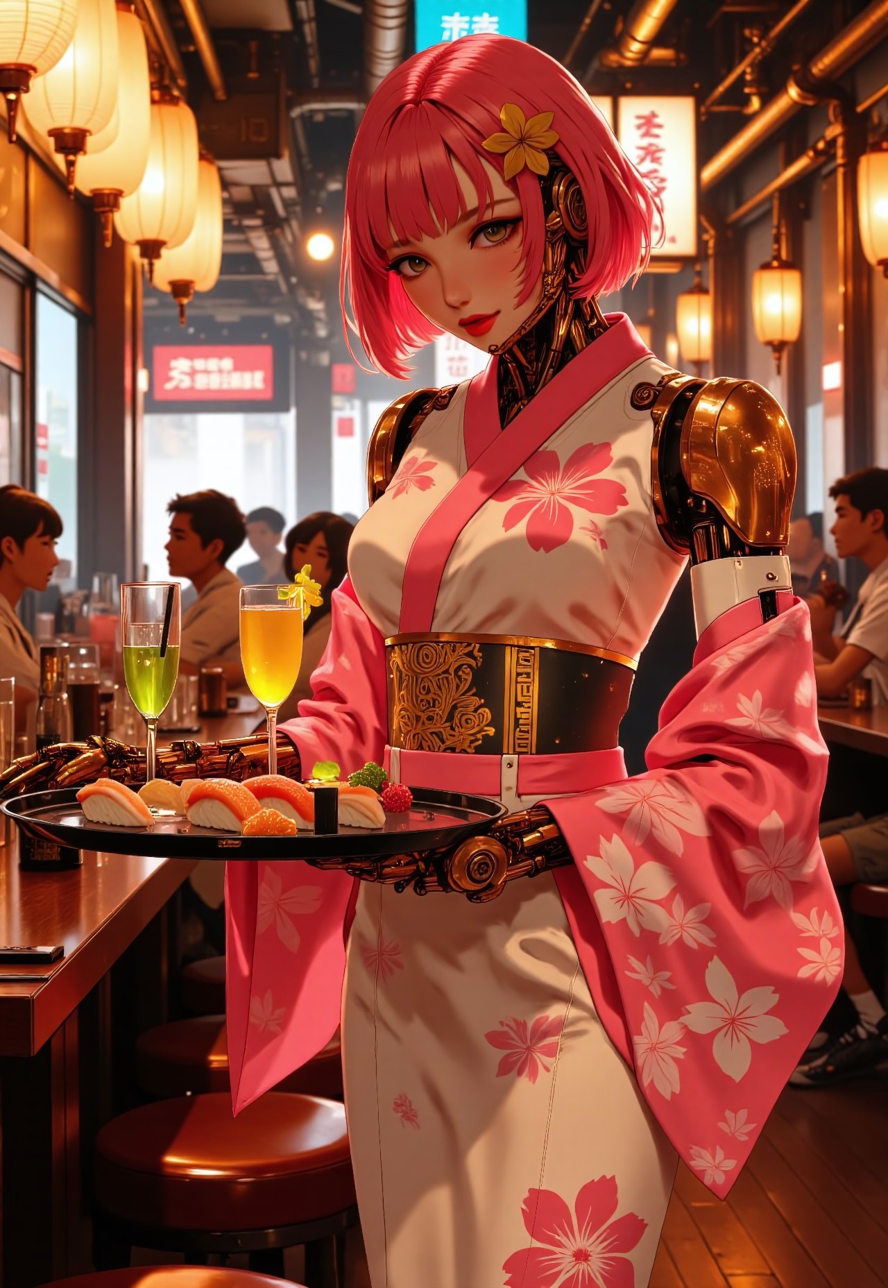 female Japanese android waitress, photorealistic, standing inside a warm, neon-lit futuristic pub. Her sleek, polished body blends traditional and cybernetic aestheticsâplated in soft white and rose-gold metal, designed to resemble a high-tech kimono with glowing cherry blossom patterns across her synthetic silk sleeves. She wears a robotic obi belt that pulses gently with golden light. Her face is smooth and doll-like, with subtle markings and soft pink lips, and her short pink hair is styled in a chic bob with a glowing sakura hairpin. Her jointed mechanical arms move gracefully, holding a lacquered serving tray stacked with glowing cocktails and neon sushi. Around her, the pub glows with warm holographic signage, paper lanterns mixed with industrial piping, and cozy booths filled with futuristic patrons. Cyberpunk, elegant, high detail, ambient lighting, barmaid aesthetic, kawaii android, Japanese cyberpunk fusion.