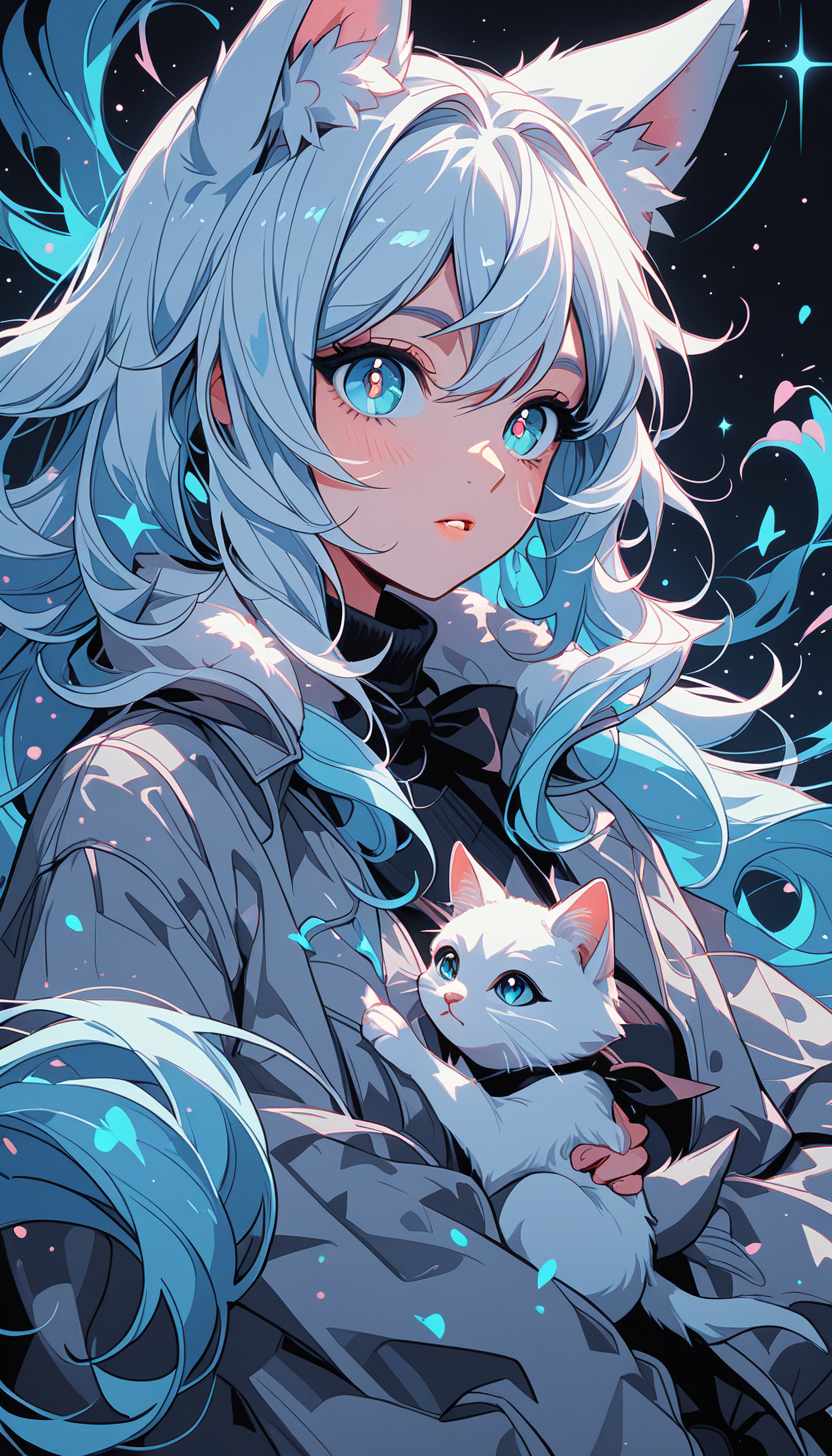 masterpiece, Shinkaistyle, pinkretroanime, retro art, Cyberpunk Style, cyberpunk, science fiction, hi tech, future tech, neon, (Cybernetics:1.25), (Neon Cityscape:1), (lineless:1.5), smooth edges, tall body, slender body, fit body, long legs, In the center of the image, there's a young girl with striking blue eyes and long white hair. She's wearing a black top adorned with silver studs and a matching pair of earrings that sparkle under the light. Her expression is one of concern, as if she's deeply troubled or worried. The background of the image is a dark sky, filled with floating particles of a light blue color, creating an ethereal atmosphere. The girl is standing in front of a large, white wolf that sits attentively by her side. The wolf's fur shines under the soft glow from above, and its eyes are trained on something out of frame. The image has a watercolor effect, adding a dreamlike quality to the scene. A gentle light from the top left corner illuminates the girl and the wolf, casting long shadows behind them on what appears to be a snow-covered ground. The overall tone of the image is one of quiet solitude and introspection, with the girl and her wolf companion as its focal point., 1girl, solo, long hair, looking at viewer, blush, open mouth, bangs, blue eyes, simple background, shirt, long sleeves, white background, bow, ribbon, holding, animal ears, hair between eyes, very long hair, closed mouth, blue hair, jacket, tail, white shirt, upper body, white hair, grey hair, sidelocks, multicolored hair, parted lips, open clothes, teeth, cat ears, bowtie, scarf, sweater, open jacket, coat, animal ear fluff, gradient, symbol-shaped pupils, fur trim, petals, black shirt, fox ears, gradient background, sparkle, black bow, floating hair, turtleneck, animal, hair intakes, cat, white jacket, black background, fox girl, bright pupils, extra ears, black bowtie, turtleneck sweater, grey jacket, white coat, white sweater, black sweater, holding animal, white fur, fox, white cat, holding cat, animal hug
