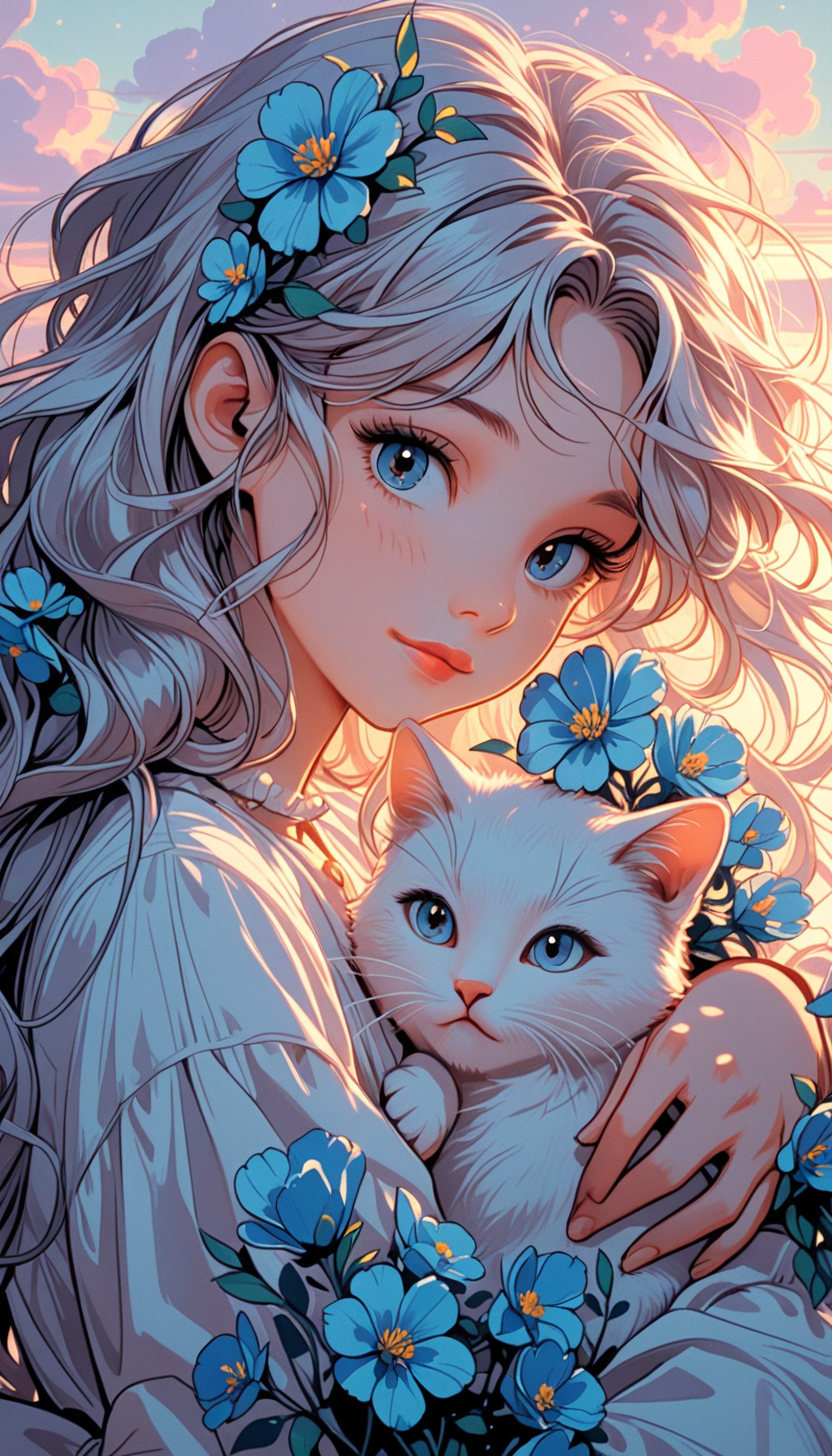 masterpiece, Shinkaistyle, pinkretroanime, retro art, Cyberpunk Style, cyberpunk, science fiction, hi tech, future tech, neon, (Cybernetics:1.25), (Neon Cityscape:1), (lineless:1.5), smooth edges, tall body, slender body, fit body, long legs, This is a digital artwork depicting a fantasy scene. At the center, there's a young female with light blue hair and large, expressive blue eyes. She has fair skin, high cheekbones, and her hair cascades down. The girl is wearing a white, flowing dress adorned with small blue flowers at the hem. She holds a white cat in her arms, which appears to be calmly nestled against her chest. The cat's fur is soft and fluffy, blending with the lightness of the background. The girl and the cat are surrounded by large clusters of blue flowers that seem to glow from within, casting a soothing light around them. These clusters appear to be scattered throughout the image, giving the impression of an enchanted garden or meadow. In the background, there's a serene sky with gentle white clouds. The colors are predominantly soft blues and whites, contributing to the ethereal and magical atmosphere of the scene. The overall composition suggests a peaceful moment captured in time, possibly during the late afternoon or early evening given the warm, ambient lighting. The character's position is central, with the cat resting comfortably against her, highlighting the bond between them. The style of the artwork is reminiscent of anime or manga illustrations, with a focus on pastel colors and delicate line art that emphasizes softness and dreamlike quality. (sunset:1.9), (dusk:1.9), (twilight:1.95), 1girl, solo, long hair, looking at viewer, blush, smile, bangs, blue eyes, blonde hair, simple background, shirt, hair ornament, long sleeves, white background, dress, bow, ribbon, holding, sitting, very long hair, closed mouth, white shirt, upper body, flower, white hair, grey hair, frills, puffy sleeves, looking back, hair flower, grey background, white dress, from side, lips, head tilt, parted bangs, looking to the side, eyelashes, hug, makeup, animal, leaf, wavy hair, expressionless, cat, white bow, light smile, plant, white flower, frilled sleeves, messy hair, white ribbon, forehead, puffy long sleeves, blue flower, curly hair, light blush, floral background, holding flower, red lips, back bow, head wreath, animal on head, holding animal, white fur, too many, white theme, on lap, white cat, holding cat, petting, animal hug, animal on lap
