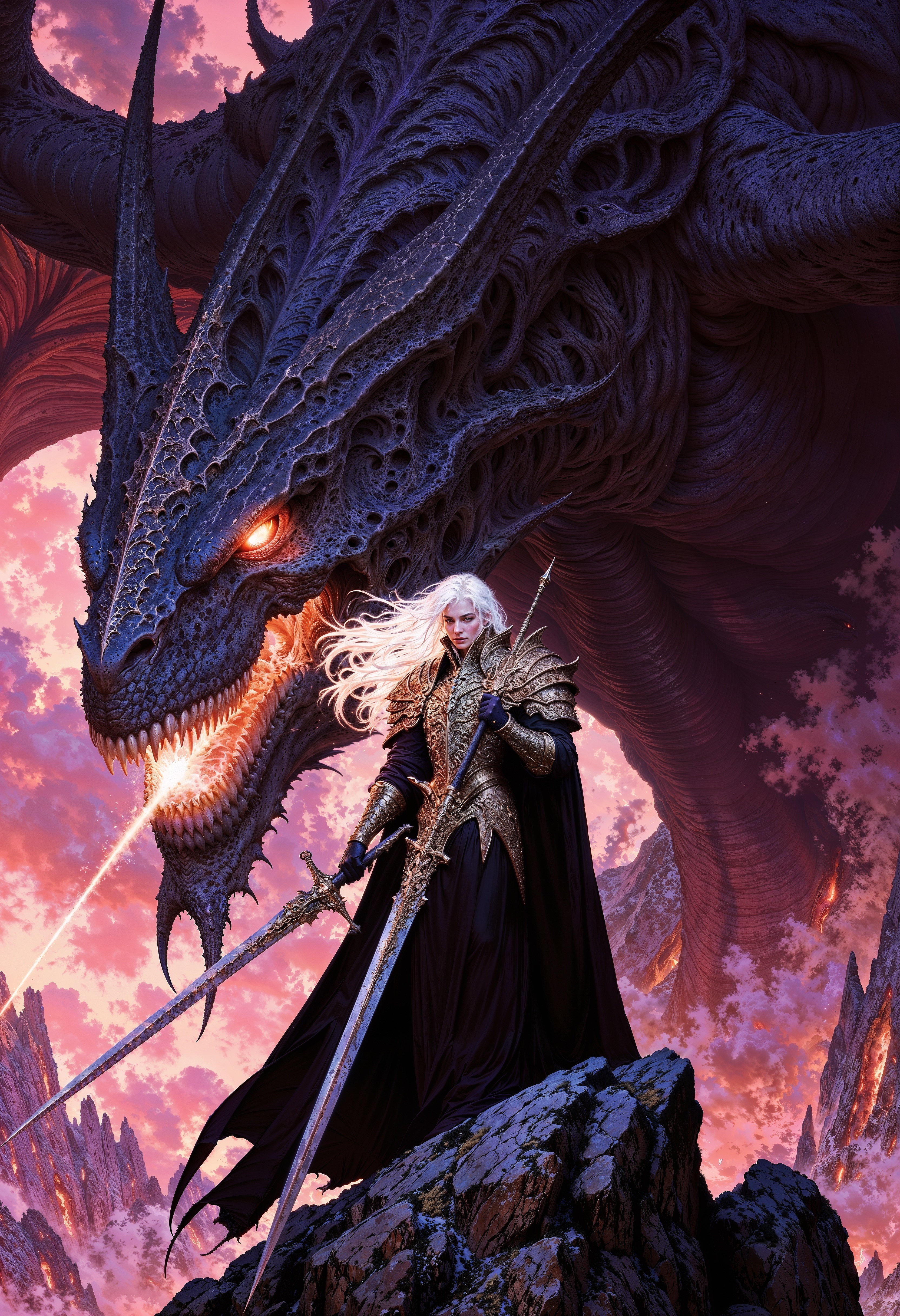 A dark and dramatic fantasy scene featuring a regal, pale-haired sorceress clad in intricate black and gold armor. She stands poised on jagged, rocky terrain overlooking a vast, ethereal landscape bathed in a sinister glow of pink and purple hues. Behind her looms a colossal, menacing dragon with an obsidian-scaled body and glowing crimson eyes that pierce through the gloom. The dragon’s maw shows its sharp teeth, and untamed power, as faint wisps of smoke and glowing embers seep from its maw. The sorceress wields a massive, rune-inscribed sword, her flowing hair and cloak moving with an unseen wind. The atmosphere is ominous yet captivating, with clouds swirling ominously in the background, reflecting the interplay of light and shadow. A perfect blend of gothic elegance and primal ferocity. dark fantasy, gothic sorceress, dragon companion, glowing eyes, stormy atmosphere, otherworldly landscape, intricate armor, epic scale, dramatic lighting, mystical power, high detail. <lora:FluxMythV2:0.6> <lora:ck-painterly-fantasy:0.6> <lora:flux.1_lora_flyway_Epic-detail_v2:0.5> <lora:RetroAnimeFluxV1:0.7>