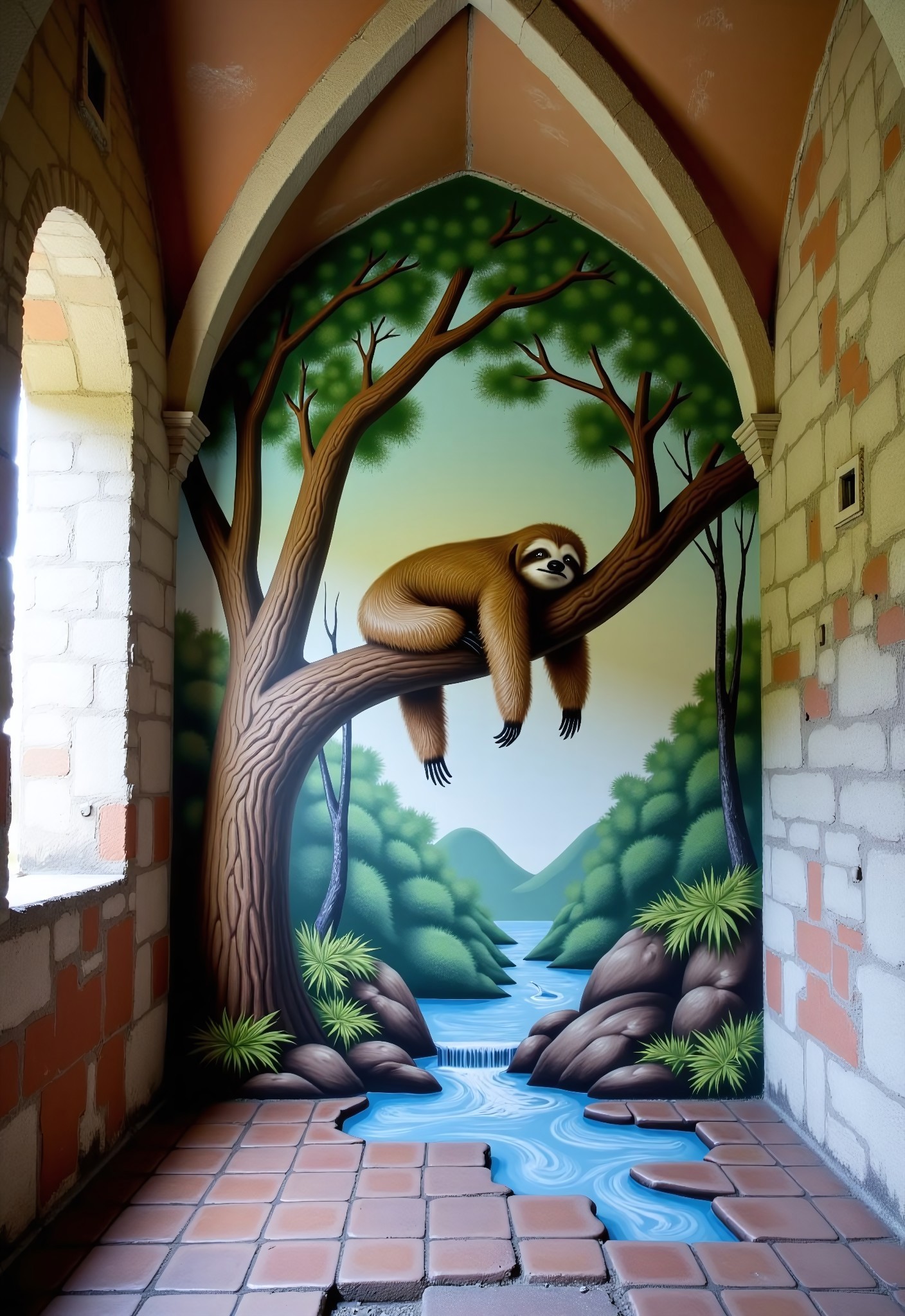 aidmaimageupgrader, a high quality digital image of a large intricately detailed hand drawn mural on a wall within a ruined ancient church, the scene on the mural depicts an adorable sloth relaxing in a tree over a gently flowing river, a little bit of water from the river has spilled out from the mural on to the church floor