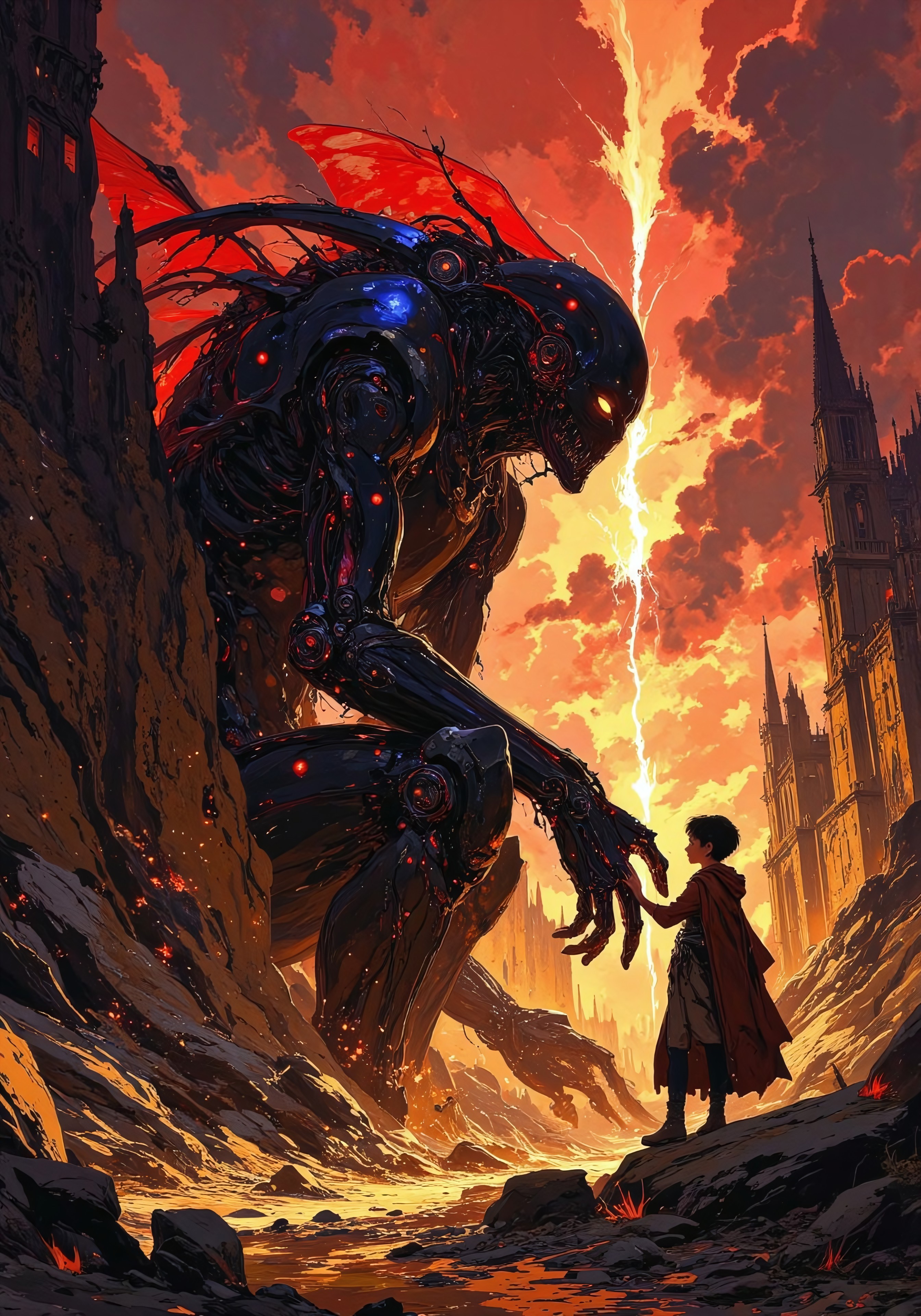 Masterpiece, ultra-detailed concept art. In the center of a vast, apocalyptic landscape, a massive, towering, obsidian robotic entity kneels beside a small human figure—a young hero clad in a tattered cloak, boots scuffed from travel. The robot’s sleek black alloy gleams with glowing crimson and cobalt circuitry, and its plasma-soldering arms are at rest, retracted like folded wings. Its single glowing eye gazes down at the human with quiet affection. The small hero reaches up at pats the robot’s arm, looking up at it and sharing a moment of friendship. Beneath them, the colossal circuit board etched into the ground pulses softly like a living heart. Sparks flicker gently in the dusk light. Behind them, the mythic hellscape remains—towering scorched cliffs, rivers of fire, and Doré-style ruined cathedrals—but there is peace between these two figures. Blood-red clouds churn overhead, but a golden beam of light breaks through, illuminating the pair. A fusion of futuristic technology and mythic apocalypse. Inspired by Gustave Doré, Moebius, and Katsuhiro Otomo. DB4RZ, DB4RZ style painting, Anime art.
