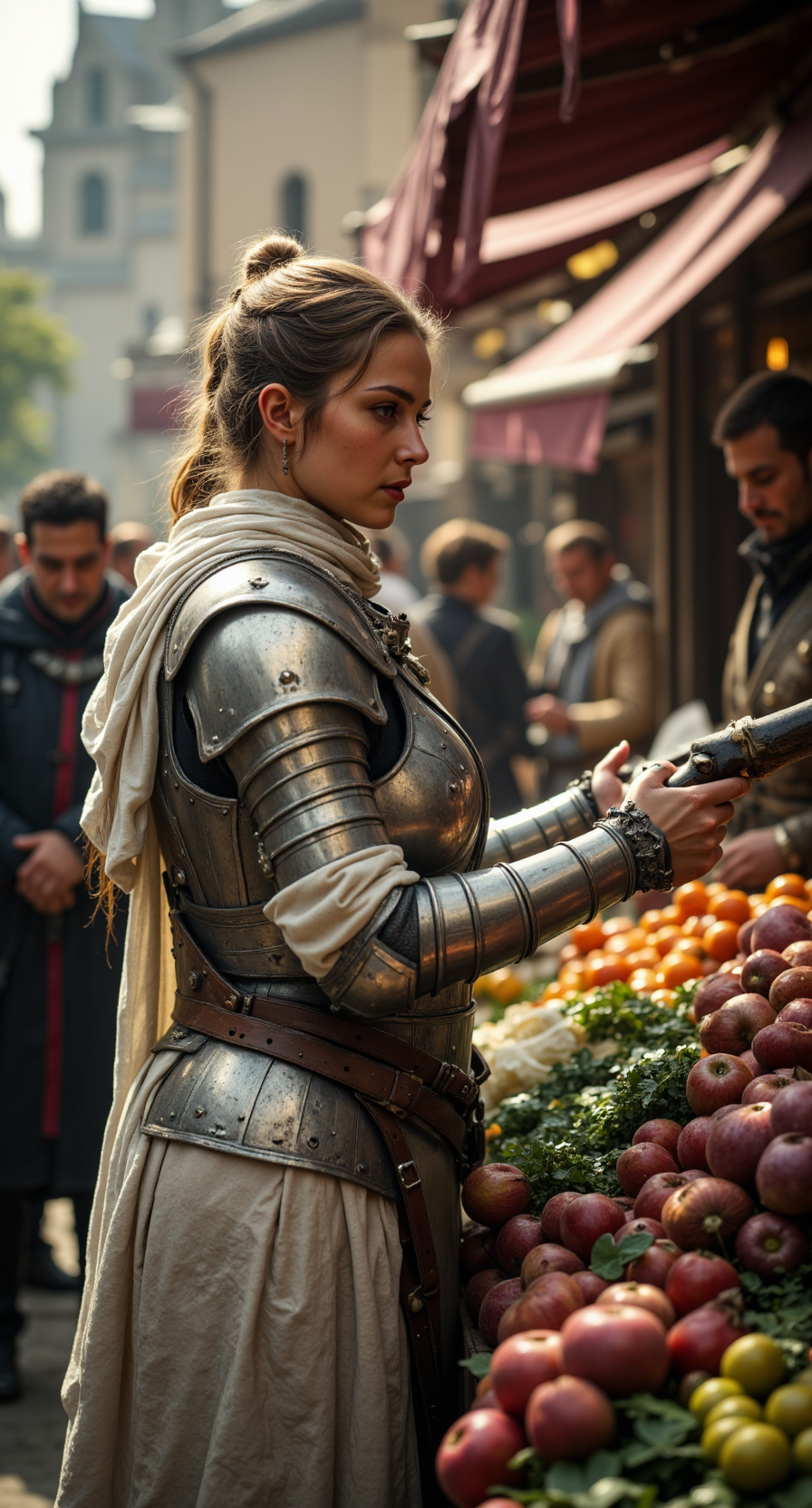 a candid street scene: woman in light ceremonial armor browsing a market stall in a medieval city, surrounded by people, her presence both elegant and imposing β photorealistic, documentary style fmlas-mk.1, R3alisticF